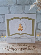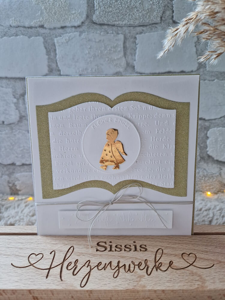 Sissi vom Instagram Account „tilas_herzenswerke“ hat mit der Stanzschablone „Buchseiten“ eine edle Weihnachtskarte gestaltet, die durch die Kombination aus sanftem Gold-Glitzer und einem zentralen, glänzenden Engel-Motiv auf geprägtem Hintergrund besticht. Das filigrane Design der aufgeschlagenen Seiten bietet dir die perfekte Bühne für besinnliche Botschaften oder festliche Akzente und verleiht deinen Bastelprojekten eine zeitlose, hochwertige Ästhetik.