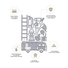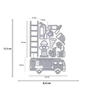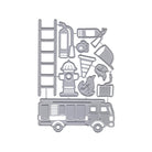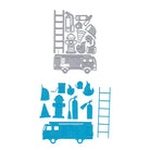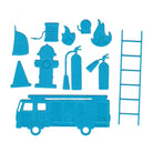 Größe der Elemente: Feuerwehrauto: 8,4 x 3,8 cm; Leiter: 2,1 x 8,4 cm; Sauerstoff: 1,9 x 4,1 cm; Kleines Feuer: 1,6 x 2 cm; Gesamtmaß der Stanze: 12,3 cm.