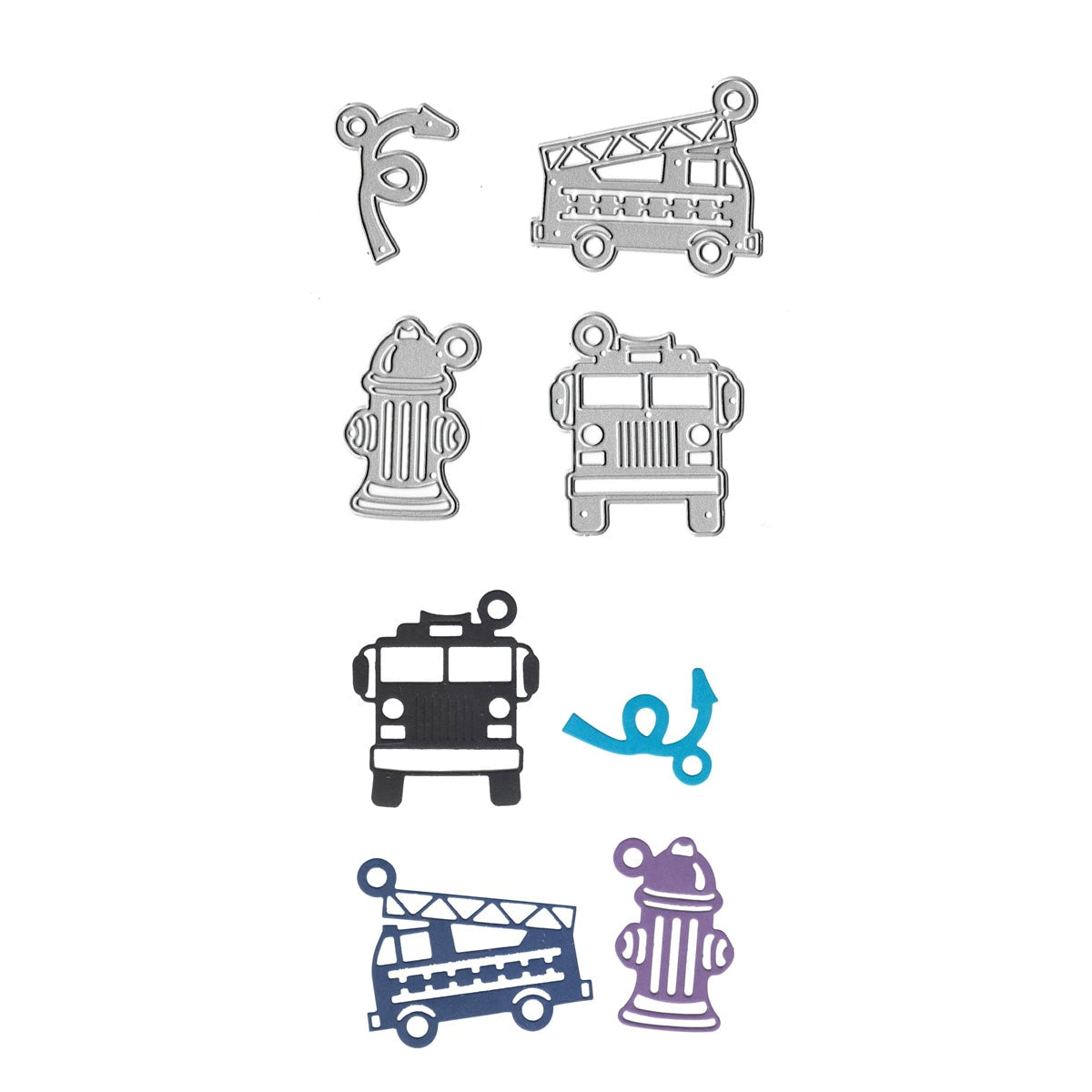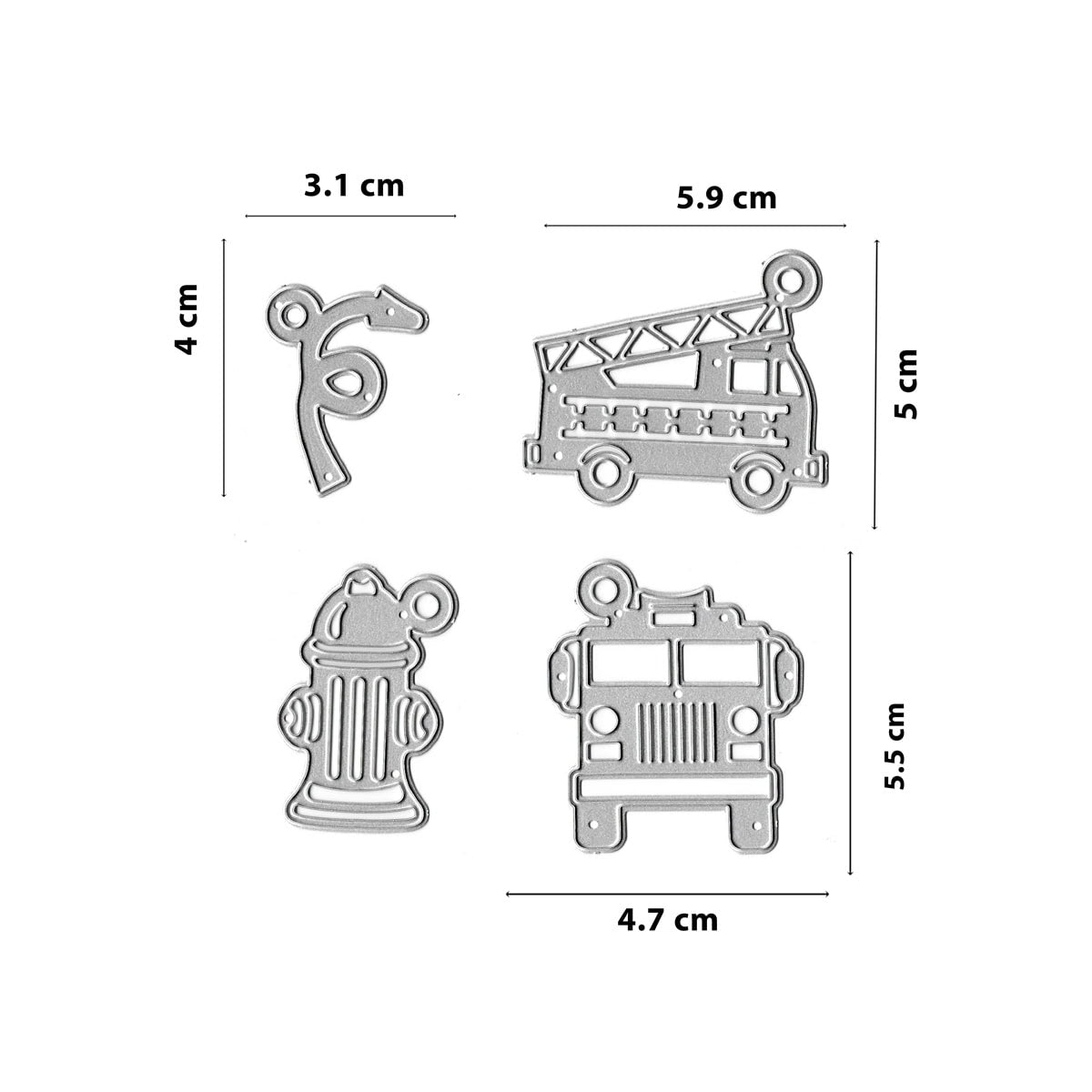 Größe: Feuerwehrauto mit Leiter: 5,9 cm x 5 cm | Feuerwehrfahrzeug front: 4,7 cm x 5,5 cm | Hydrant: 4 cm | Feuerwehrschlauch: 3,1 cm.