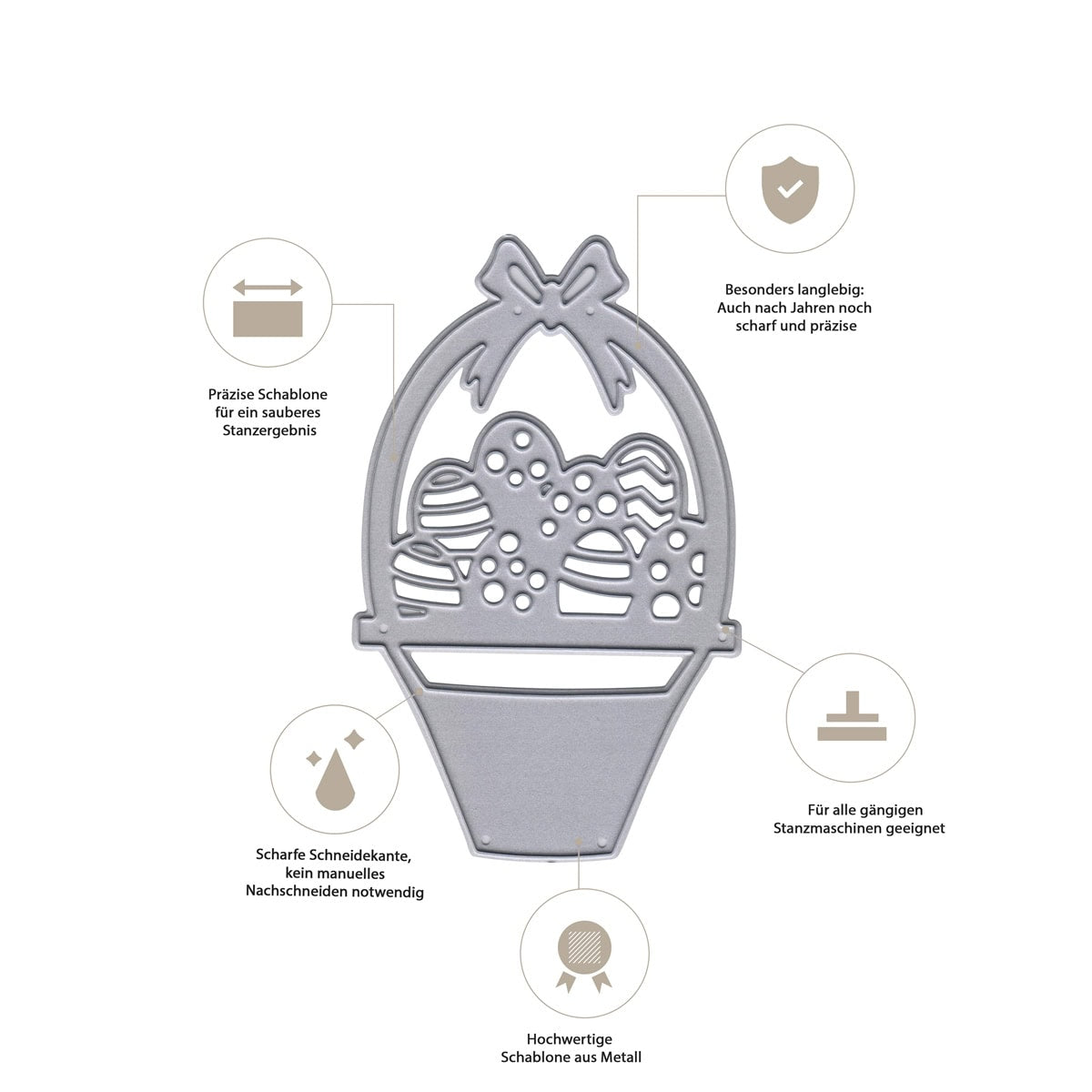 Unsere Stanzschablonen sind grundsätzlich mit allen Stanzmaschinen kompatibel, wenn sie hineinpassen. Für die Stanzschablone Osterkorb mit Schleife gilt: