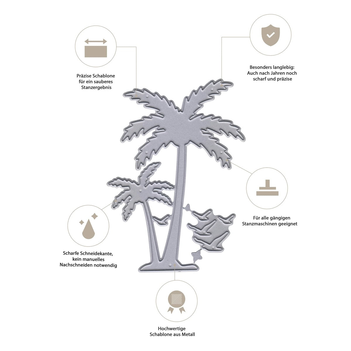 Unsere Stanzschablonen sind grundsätzlich mit allen Stanzmaschinen kompatibel, wenn sie hineinpassen. Für die Stanzschablone Palmen mit fliegenden Vögeln gilt: