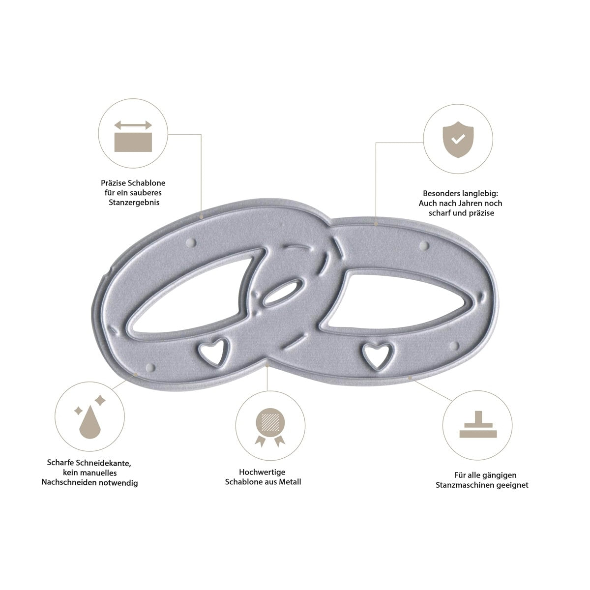 Unsere Stanzschablonen sind grundsätzlich mit allen Stanzmaschinen kompatibel, wenn sie hineinpassen. Für die Stanzschablone Ringe mit Herzgravur gilt: