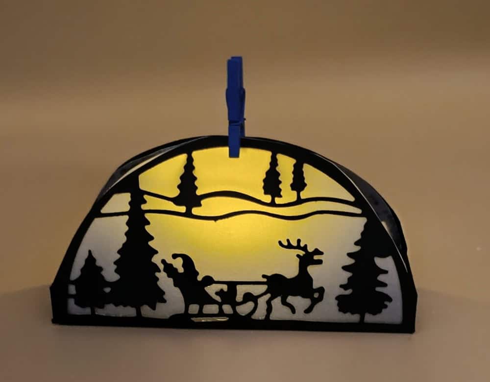 Schlitten mit Rentier und Tannenbäumen in Halbkreis Form, Gesamte Stanze ca. 11 x 5,5 cm groß.