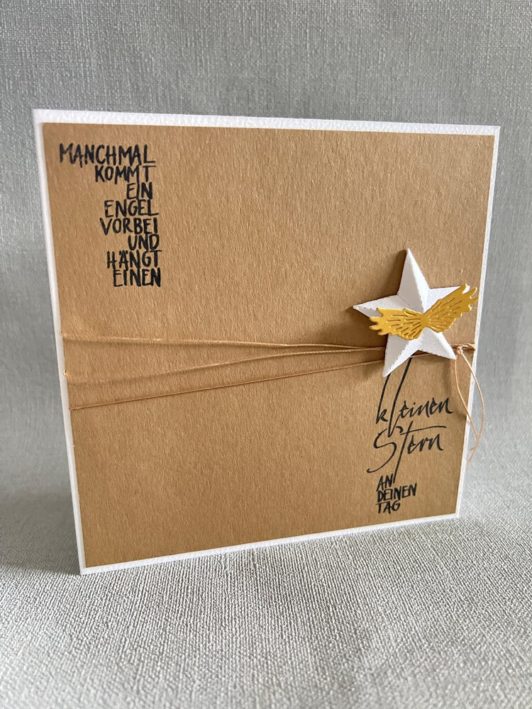 Anja vom Instagram Account be_sweet76 hat mit der Stanzschablone für drei dreidimensionale Sterne eine puristische und hoffnungsvolle Karte gestaltet, die durch das Zusammenspiel von naturbraunem Kraftpapier, einem strahlend weißen Stern und goldenen Engelsflügeln besticht. Die feine Kordel und der tiefgründige Spruch unterstreichen die plastische Wirkung des Sterns und zeigen wunderbar, wie du mit dieser Stanze im Handumdrehen tröstliche oder ermutigende Botschaften mit einer besonderen Haptik kreieren kannst.