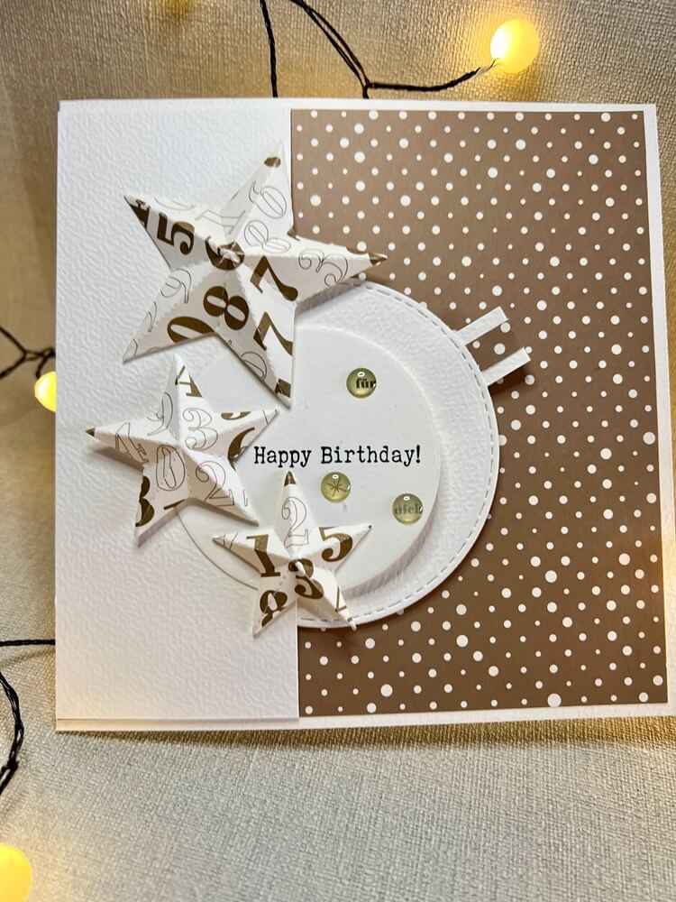 Anja vom Instagram Account be_sweet76 hat mit der Stanzschablone für drei dreidimensionale Sterne eine festliche Geburtstagskarte gestaltet, die durch den Kontrast zwischen dem braun-weißen Punktemuster und dem eleganten Zahlen-Design der Sterne sofort ins Auge fällt. Die plastisch gefalteten Sterne verleihen der Karte eine beeindruckende Tiefe und zeigen wunderbar, wie du mit dieser Stanze im Handumdrehen effektvolle 3D-Akzente für besondere Glückwunschkarten oder stimmungsvolle Dekorationen setzen kannst.