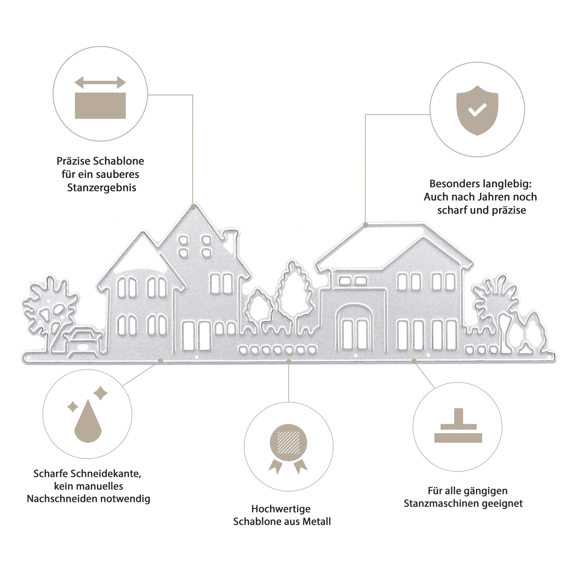 Unsere Stanzschablonen sind grundsätzlich mit allen Stanzmaschinen kompatibel, wenn sie hineinpassen. Für die Stanzschablone: Kleinstadt mit Bäumen gilt: