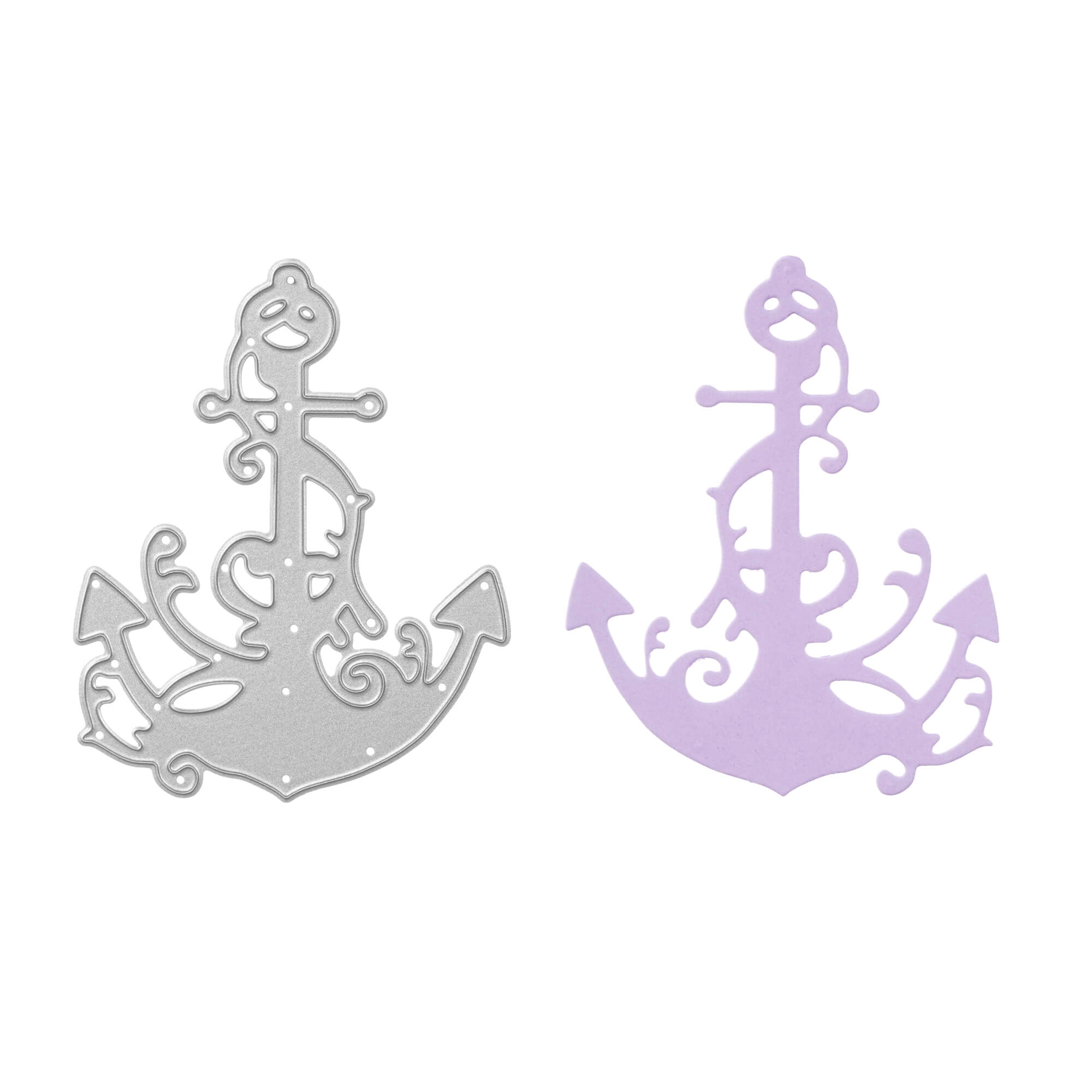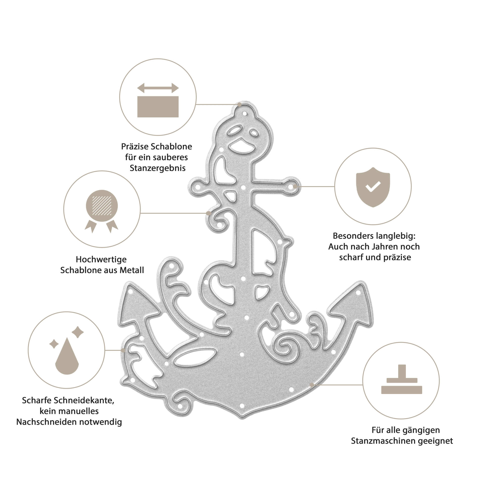Unsere Stanzschablonen sind grundsätzlich mit allen Stanzmaschinen kompatibel, wenn sie hineinpassen. Für die Stanzschablone Anker mit Verschnörkelung gilt: