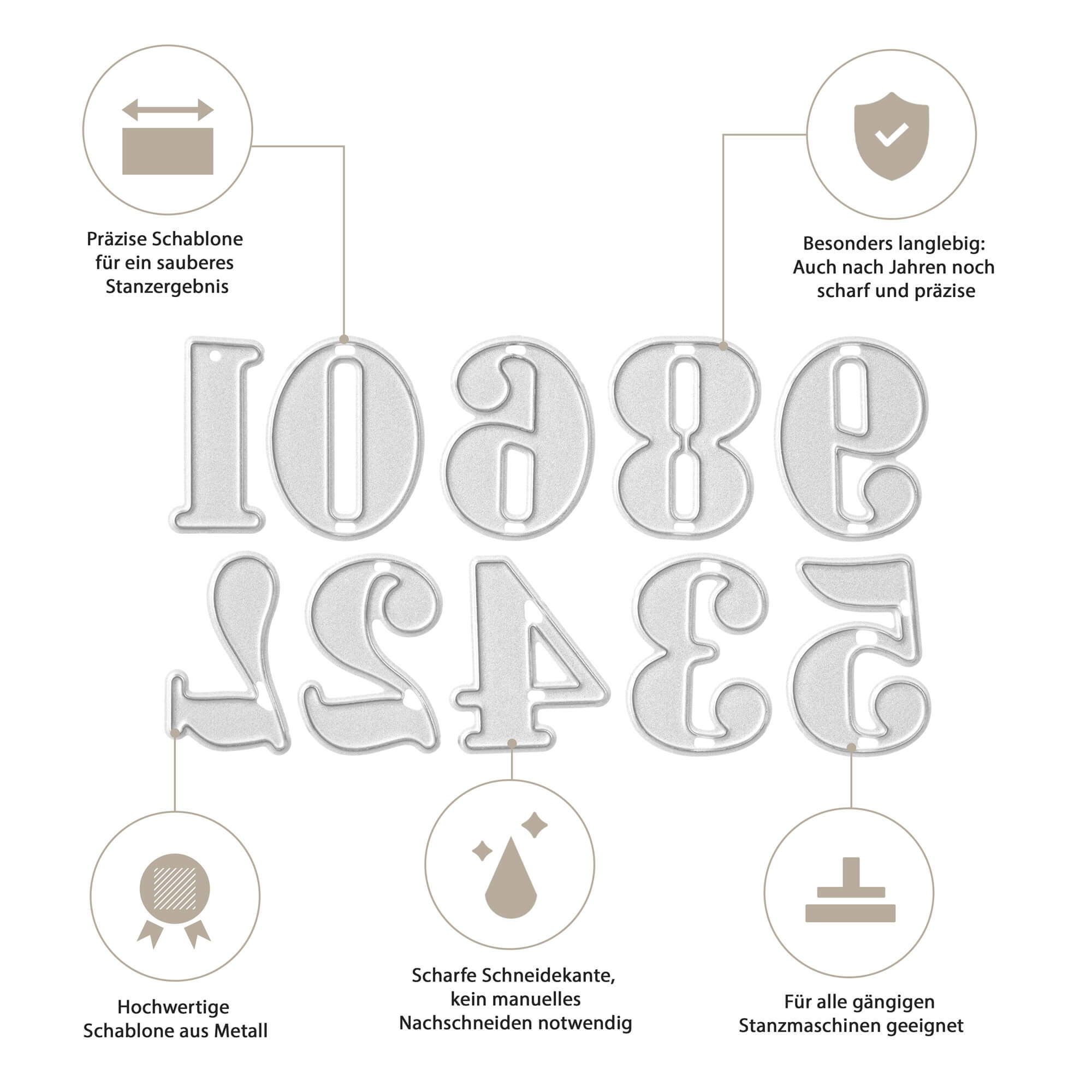 Unsere Stanzschablonen sind grundsätzlich mit allen Stanzmaschinen kompatibel, wenn sie hineinpassen. Für die Stanzschablone: Zahlen 0 - 9 gilt: