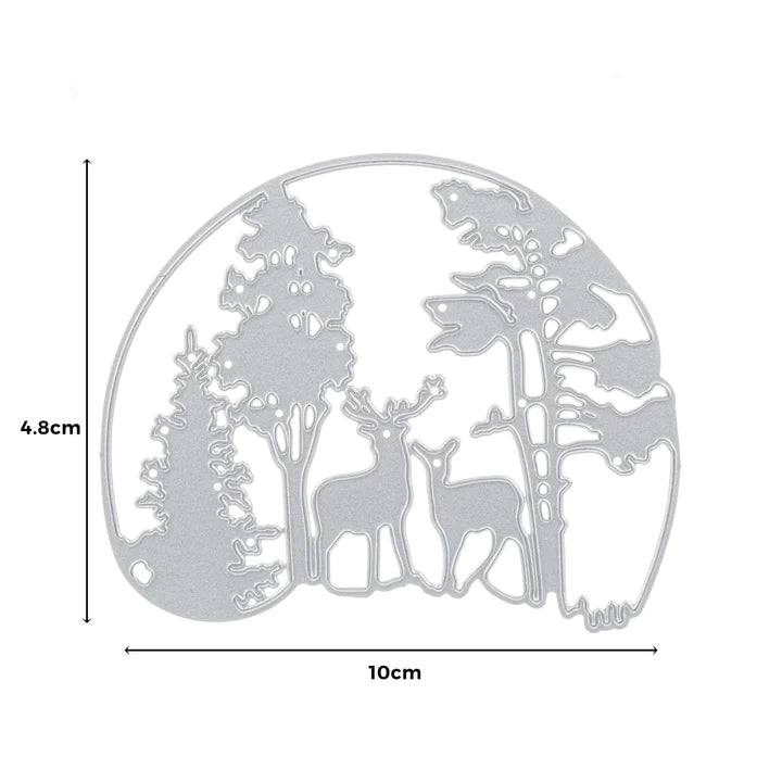 Diese zauberhafte Weihnachtskarte wurde mit der Stanzschablone „Winterlandschaft im Halbkreis“ gestaltet und versprüht eine stimmungsvolle, winterliche Atmosphäre. Die Silhouette zeigt zwei Rehe in einer verschneiten Waldlandschaft, umgeben von hohen Tannen und kahlen Bäumen. Im Hintergrund funkeln kleine Sterne, die mit silbernem Glitzer hervorgehoben wurden. Der schwarze Karton kontrastiert perfekt mit den weißen Akzenten und verleiht der Karte einen eleganten und gleichzeitig festlichen Look. Der Schriftzug „Frohe Weihnachten“ rundet das Design ab und macht die Karte zu einem wunderschönen Weihnachtsgruß.