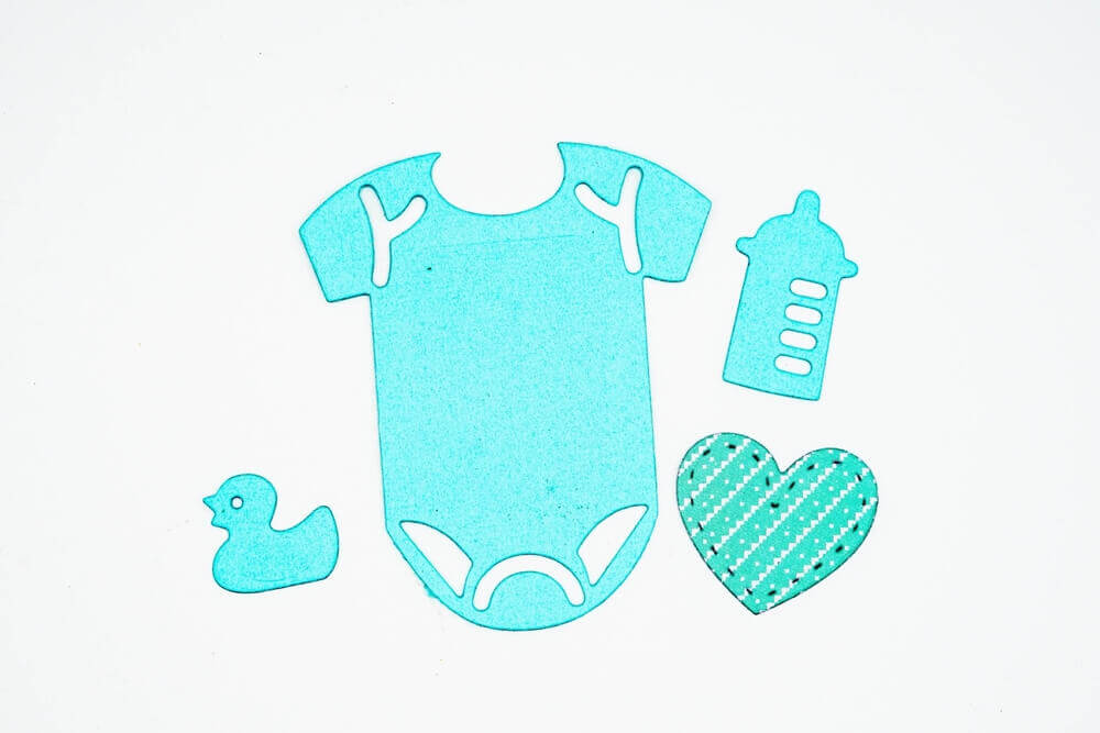 Größe der Stanzen: Strampler: 7 x 7,5 cm / Flasche: 2,1 x 3,5 cm / Ente: 2,4 x 2 cm / Herz: 3,5 x 3 cm.
