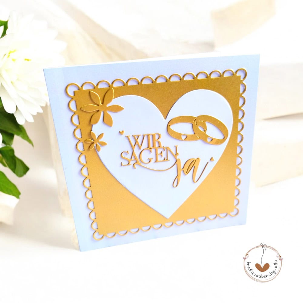 Nina vom Instagram Account kreativzauber_by_nilu hat mit den Stanzschablonen Ringe mit Herzgravur und Quadrate mit Wellenrand eine edle Hochzeitskarte gestaltet, die durch das glänzende Gold auf zartem Hellblau besonders hochwertig wirkt. Das zentrale Herz mit dem Schriftzug „Wir sagen ja“ wird perfekt von den filigranen Ringen und dem verspielten Wellenrand eingerahmt, was zeigt, wie du mit diesen Stanzen im Handumdrehen stilvolle und emotionale Glückwünsche für den großen Tag kreieren kannst.