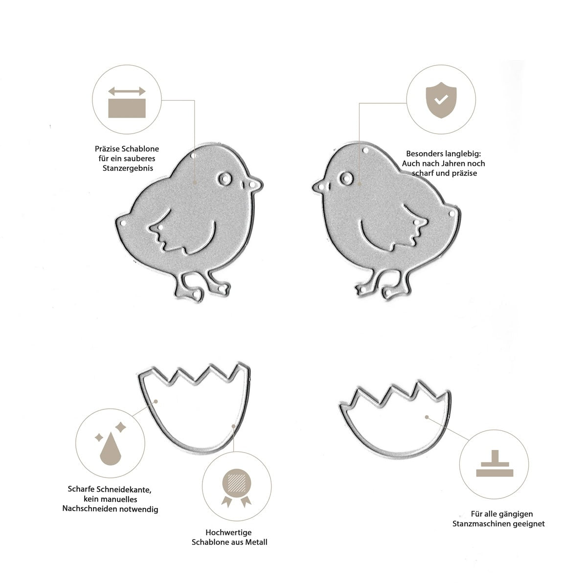 Unsere Stanzschablonen sind grundsätzlich mit allen Stanzmaschinen kompatibel, wenn sie hineinpassen. Für die Stanzschablone Küken & Eierschale gilt:
