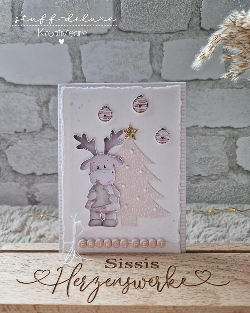Sissi vom Instagram Kanal tilas_herzenswerke hat mit unserer Stanzschablone großer Tannenbaumanhänger diese zauberhafte Weihnachtskarte in skandinavisch-zarten Pastelltönen gestaltet. Der liebevoll verzierte, zartrosa Tannenbaum bildet den perfekten Mittelpunkt und zeigt, wie du unsere Anhänger-Stanzen als bezaubernde Motive für deine Festtagskarten einsetzen kannst.