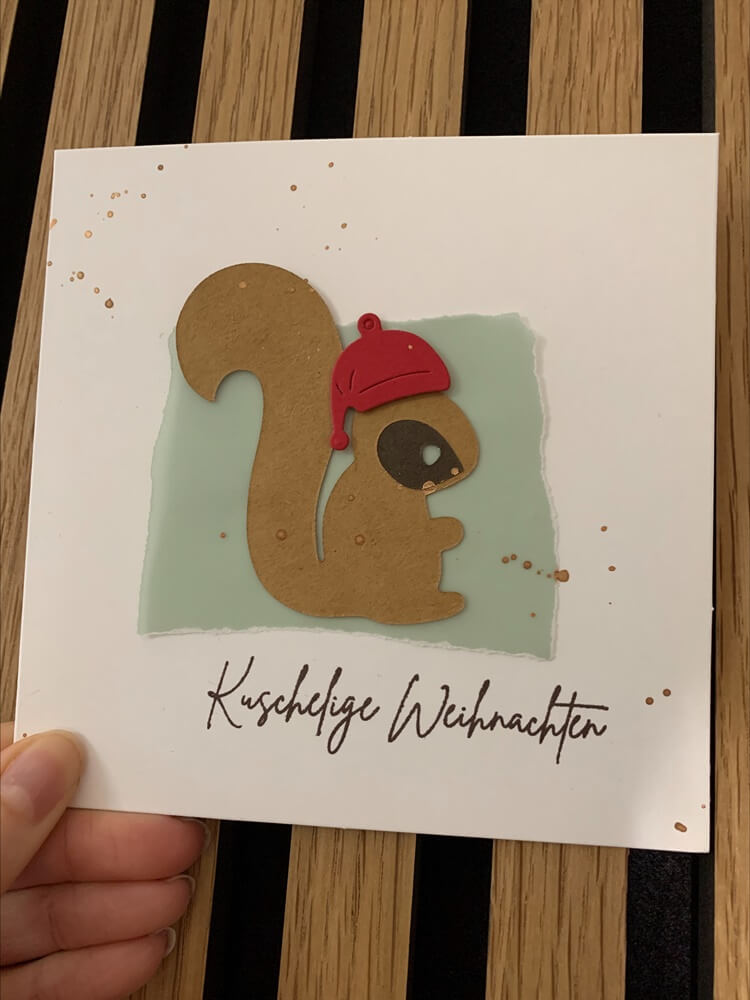 Dana vom Kanal Papierdrama bei Youtube hat mit der Stanzschablone Eichhörnchen mit buschigem Schwanz eine super süße Weihnachtskarte gestaltet. Das braune Eichhörnchen mit der kleinen roten Mütze und dem mintgrünen Hintergrund zeigt, wie einfach du mit dieser Stanze bezaubernde Tiermotive mit saisonalen Akzenten kombinieren kannst.