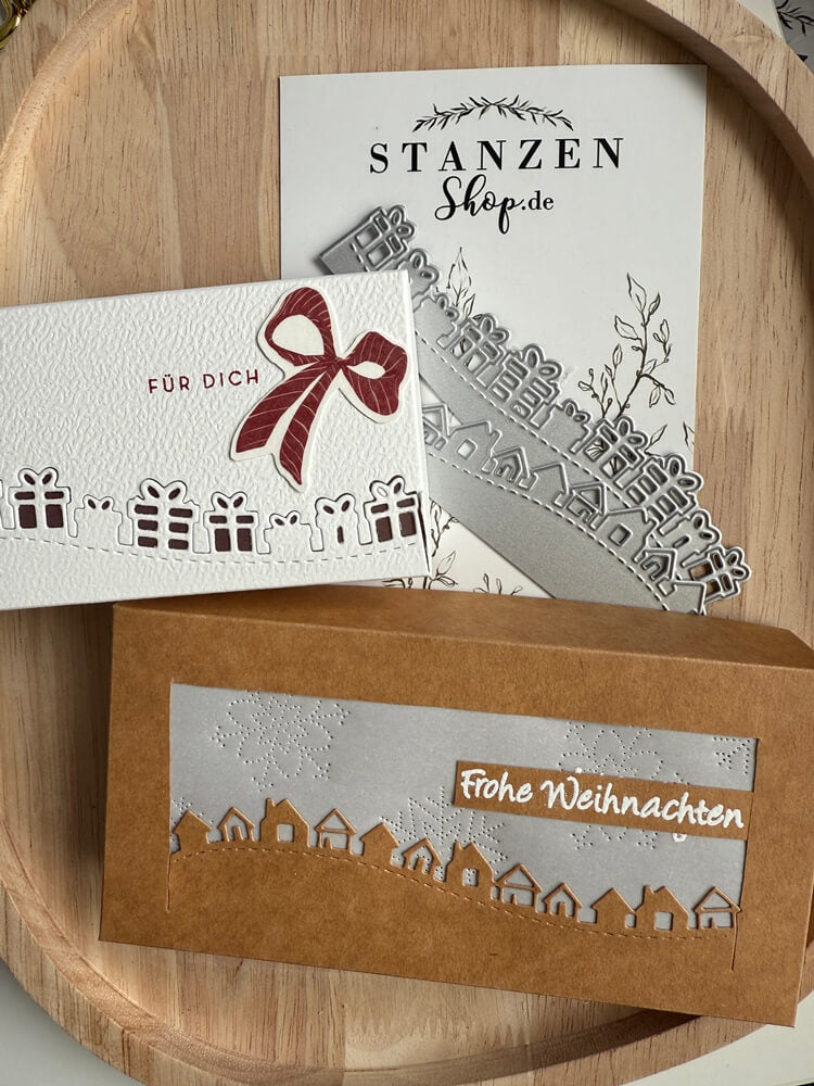Christina vom YouTube-Kanal „Christinas Bastelstube“ gestaltet mit der Stanzschablone „Geschenke/Häuserwelle“ eine stilvolle Karte sowie eine passende Geschenkverpackung, die durch edle Akzente in Burgunderrot und Kupfer auf schlichtem Kraftpapier bestechen. Diese kreativen Beispiele zeigen eindrucksvoll, wie die filigranen Wellenformen deine Bastelarbeiten im Handumdrehen in kleine Kunstwerke verwandeln und dir Raum für unzählige individuelle Gestaltungsideen lassen.