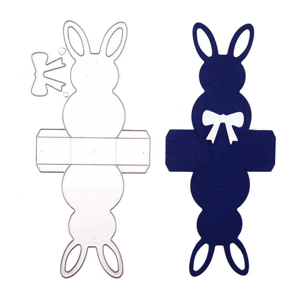 Aufsteller in Osterhasen Form mit kleiner Schleife, Gesamte Stanze ca. 14 x6 cm groß, gefalteter Auftseller ca. 6,5 x 3,5 cm groß.