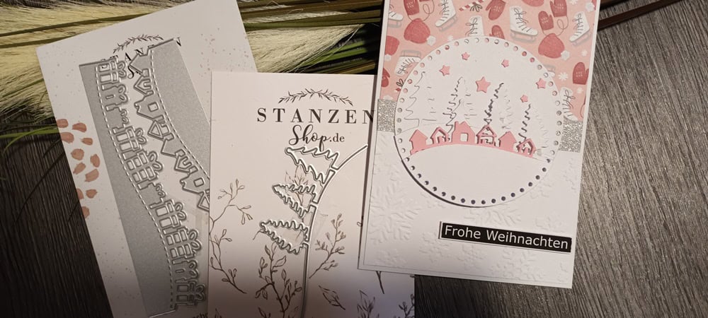 Natascha vom Kanal Chaotisch_kreativ bei YouTube & Instagram hat mit den Stanzschablonen Geschenke/Häuserwelle und Berglandschaft mit Bäumen eine verspielte Weihnachtskarte in Rosa und Weiß gestaltet, die durch einen gemusterten Hintergrund mit Schlittschuhen und Fäustlingen besonders gemütlich wirkt. Die Kombination aus der filigranen rosa Häuserreihe und den weißen Tannen im runden Rahmen zeigt wunderbar, wie du mit verschiedenen Ebenen und einer Schneeflocken-Prägung eine lebendige Winterwelt auf deine Post zaubern kannst.