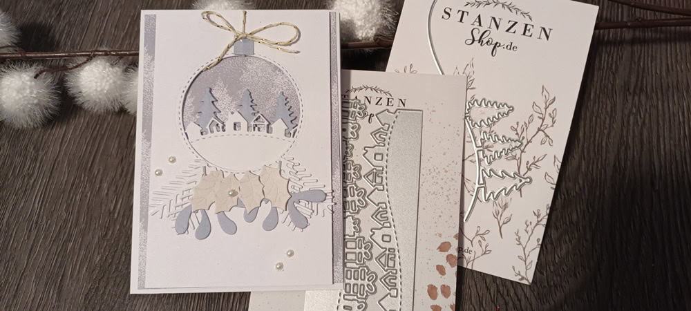 Natascha vom Kanal Chaotisch_kreativ bei YouTube & Instagram hat mit den Stanzschablonen Geschenke/Häuserwelle und Berglandschaft mit Bäumen eine elegante Winterkarte in zarten Grau- und Weißtönen gestaltet, die wie eine kleine Schneekugel wirkt. Die Kombination aus filigranen Häusersilhouetten, schimmernden Glitzerakzenten und einer rustikalen Goldkordel zeigt wunderbar, wie du verschiedene Motive zu einer harmonischen, dreidimensionalen Winterlandschaft vereinen kannst.