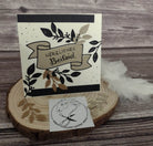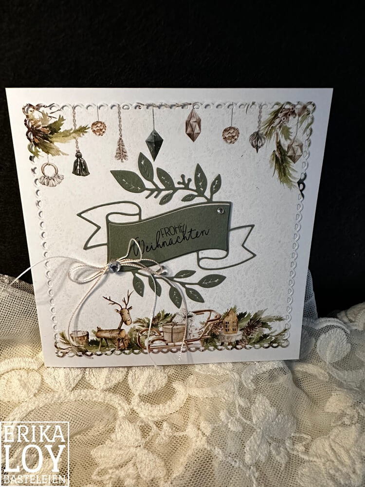 Erika von erika.loy_basteleien bei Instagram hat mit der Stanzschablone Banner mit Blättern eine edle, quadratische Weihnachtskarte gestaltet. Das salbeigrüne Banner mit dem zarten Blätterzweig harmoniert wunderbar mit den winterlichen Motiven im Hintergrund und zeigt, wie stilvoll du mit dieser Stanze festliche Botschaften und florale Akzente kombinieren kannst.