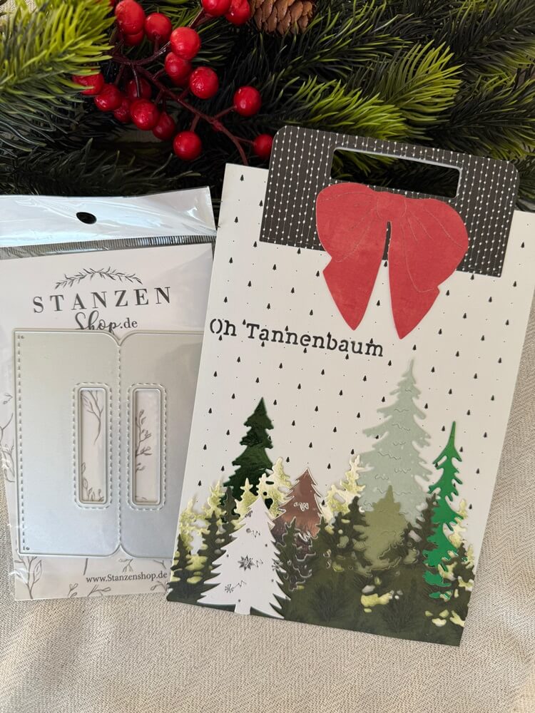 Christina vom YouTube-Kanal „Christinas Bastelstube“ veredelt mit der Stanzschablone „Griffe“ eine bezaubernde Geschenktüte, die durch den kontrastreichen schwarzen Griff und eine große rote Schleife über einer winterlichen Waldszene besticht. Diese praktische Stanze ist das ideale Werkzeug, um schlichte Papiertüten in individuelle, hochwertige Geschenkverpackungen zu verwandeln und jedem Mitbringsel eine ganz persönliche Note zu verleihen.