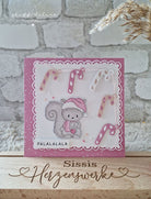 Sissi vom Instagram Kanal tilas_herzenswerke hat mit dieser bezaubernden Weihnachtskarte die Stanzschablone Quadrate mit Wellenrand als perfekten Rahmen für das pinke Weihnachtsglück eingesetzt. Das leuchtende Pink im Wellenrahmen, die süßen Zuckerstangen aus dem Weihnachtsanhänger Mix und das Eichhörnchen beweisen, wie stilvoll und modern Weihnachtsgrüße sein können.