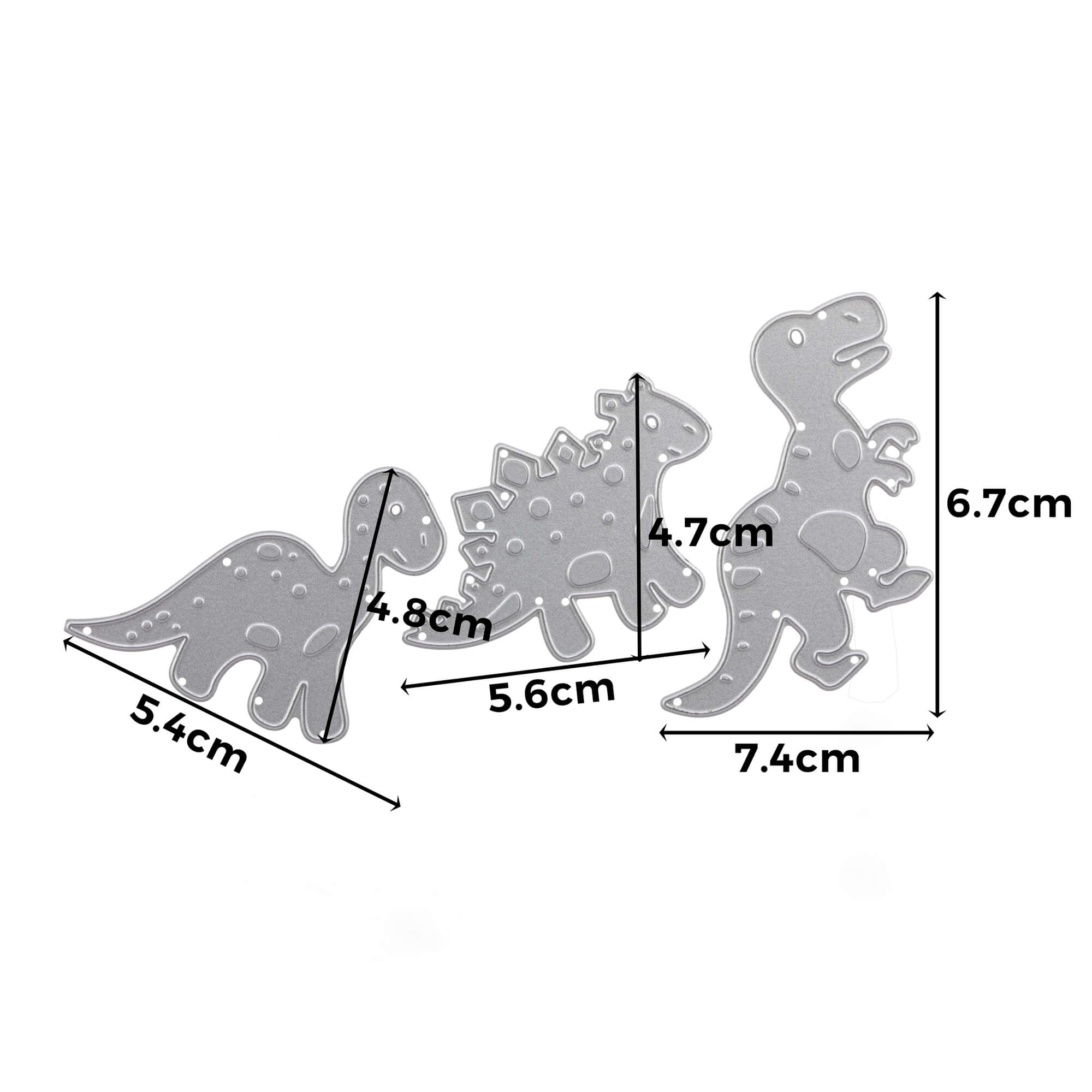 Großer Dino: 6,7 x 7,4 cm; Mittlerer Dino: 4,8 x 5,4 cm; Kleiner Dino: 4,7 x 5,6 cm.