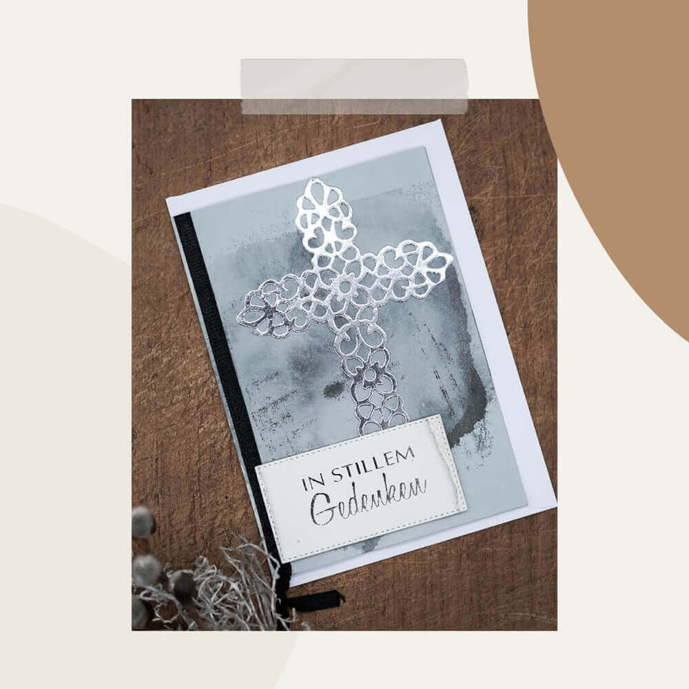 Diese Trauerkarte ist mit unserer Stanzschablone "Großes Kreuz" gestaltet und bietet eine würdevolle Möglichkeit, Beileid zu bekunden. Das Kreuz aus silbernem Papier wirkt edel und fein durch die filigrane Ausarbeitung der Schablone. Der Hintergrund in Grautönen verstärkt die ruhige und besinnliche Wirkung der Karte. Ein schlichtes Band in Schwarz rundet das Design ab. Der Schriftzug "In stillem Gedenken" in einer eleganten Schriftart ist auf einem weißen Rechteck platziert und vermittelt auf einfühlsame Weise Mitgefühl. Diese Karte eignet sich perfekt, um in schweren Zeiten Trost zu spenden und Anteilnahme auszudrücken.