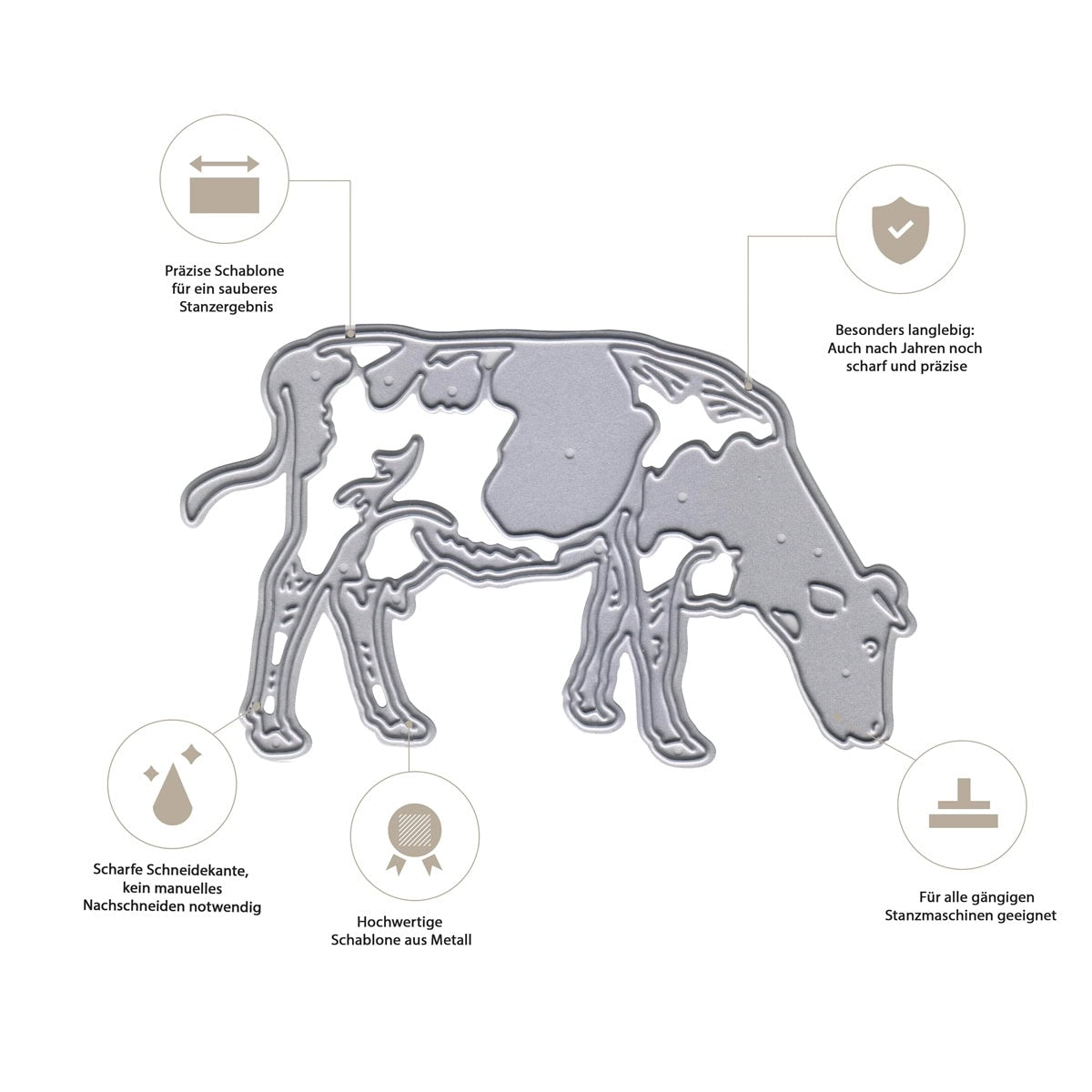 Unsere Stanzschablonen sind grundsätzlich mit allen Stanzmaschinen kompatibel, wenn sie hineinpassen. Für die Stanzschablone Kuh auf der Weide gilt: