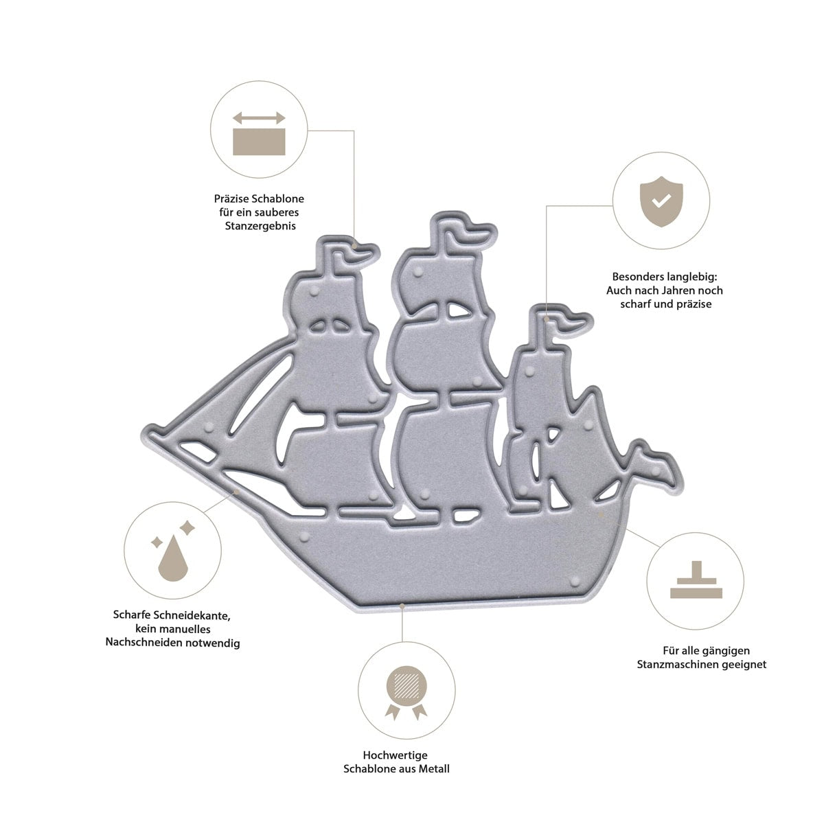 Unsere Stanzschablonen sind grundsätzlich mit allen Stanzmaschinen kompatibel, wenn sie hineinpassen. Für die Stanzschablone Segelschiff mit drei Masten gilt: