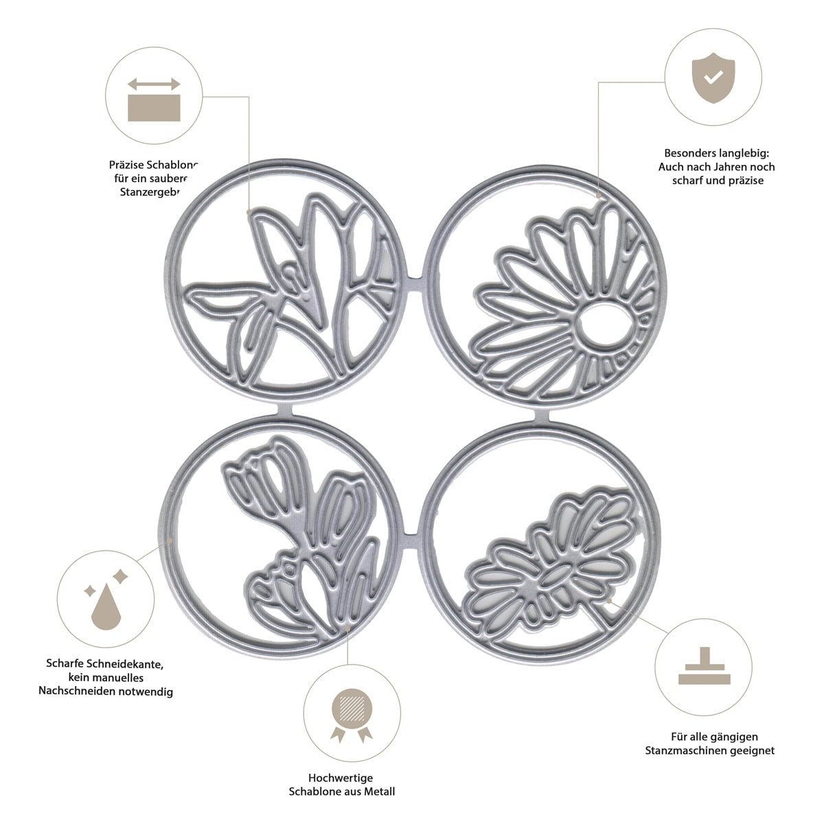 Unsere Stanzschablonen sind grundsätzlich mit allen Stanzmaschinen kompatibel, wenn sie hineinpassen. Für die Stanzschablone Blumenkreise gilt: