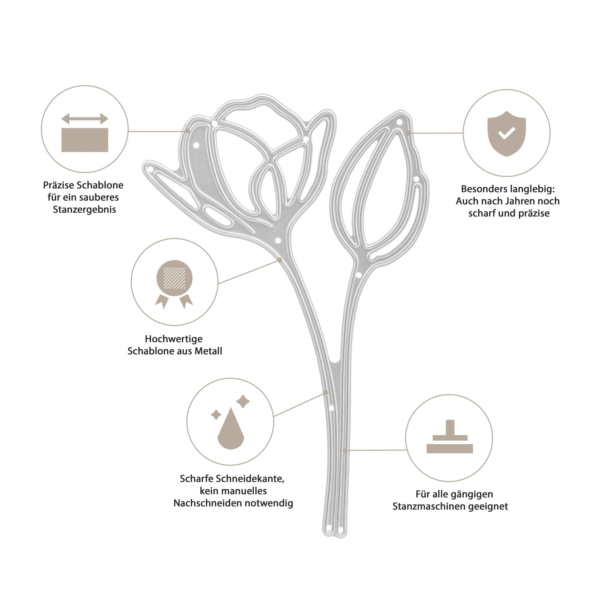 Unsere Stanzschablonen sind grundsätzlich mit allen Stanzmaschinen kompatibel, wenn sie hineinpassen. Für die Stanzschablone Blume mit zwei Blüten gilt: