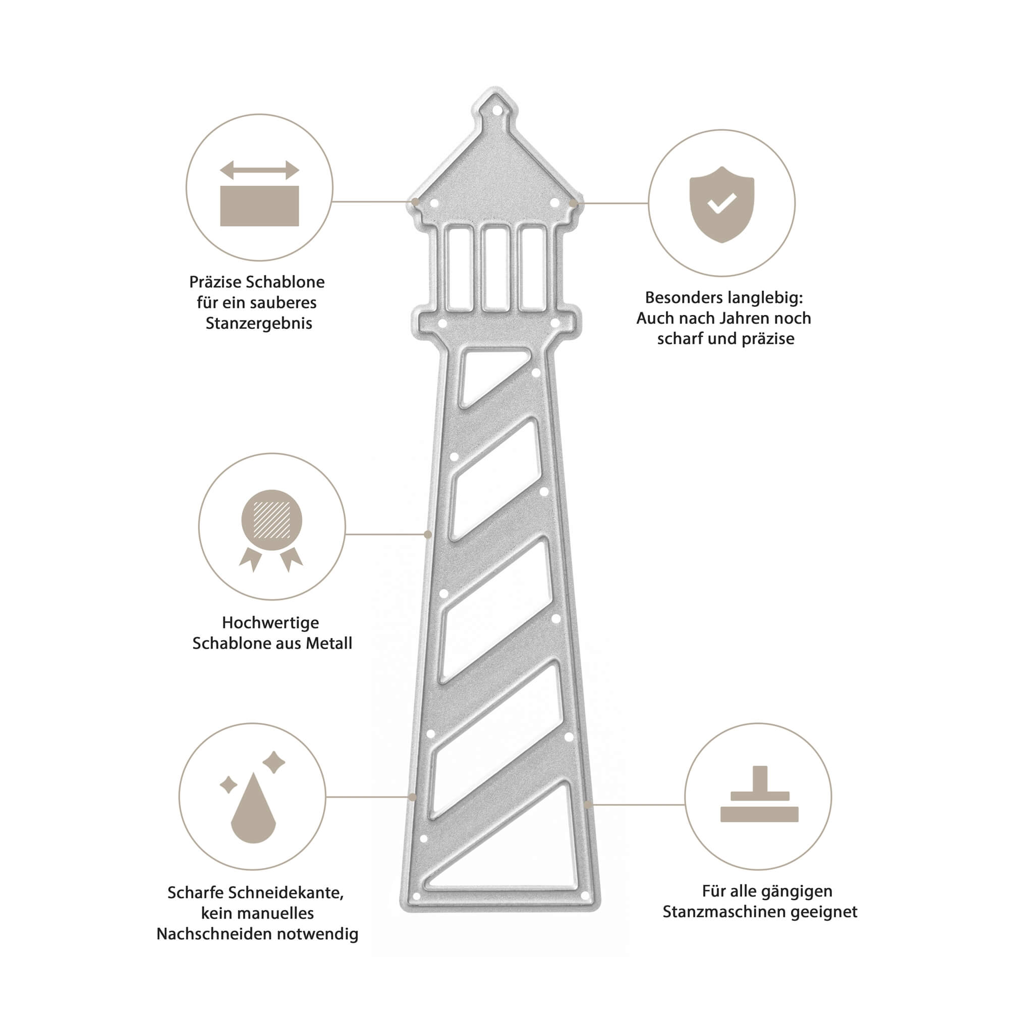 Unsere Stanzschablonen sind grundsätzlich mit allen Stanzmaschinen kompatibel, wenn sie hineinpassen. Für die Stanzschablone Großer Leuchtturm gilt: