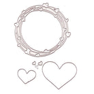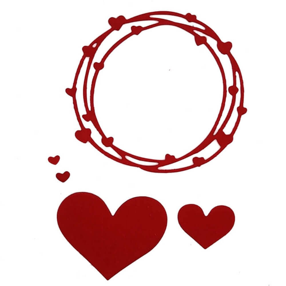 Kranz aus Herzen und vier verschiedene Herzen., Gesamte Stanze ca. 7 x 7 cm. Größes Herz ca. 4,5 x 3,5 cm, Mittleres Herz ca. 2,5 x 2 cm, zwei Mini Herzen ca. 0,5 x 0,5 cm.