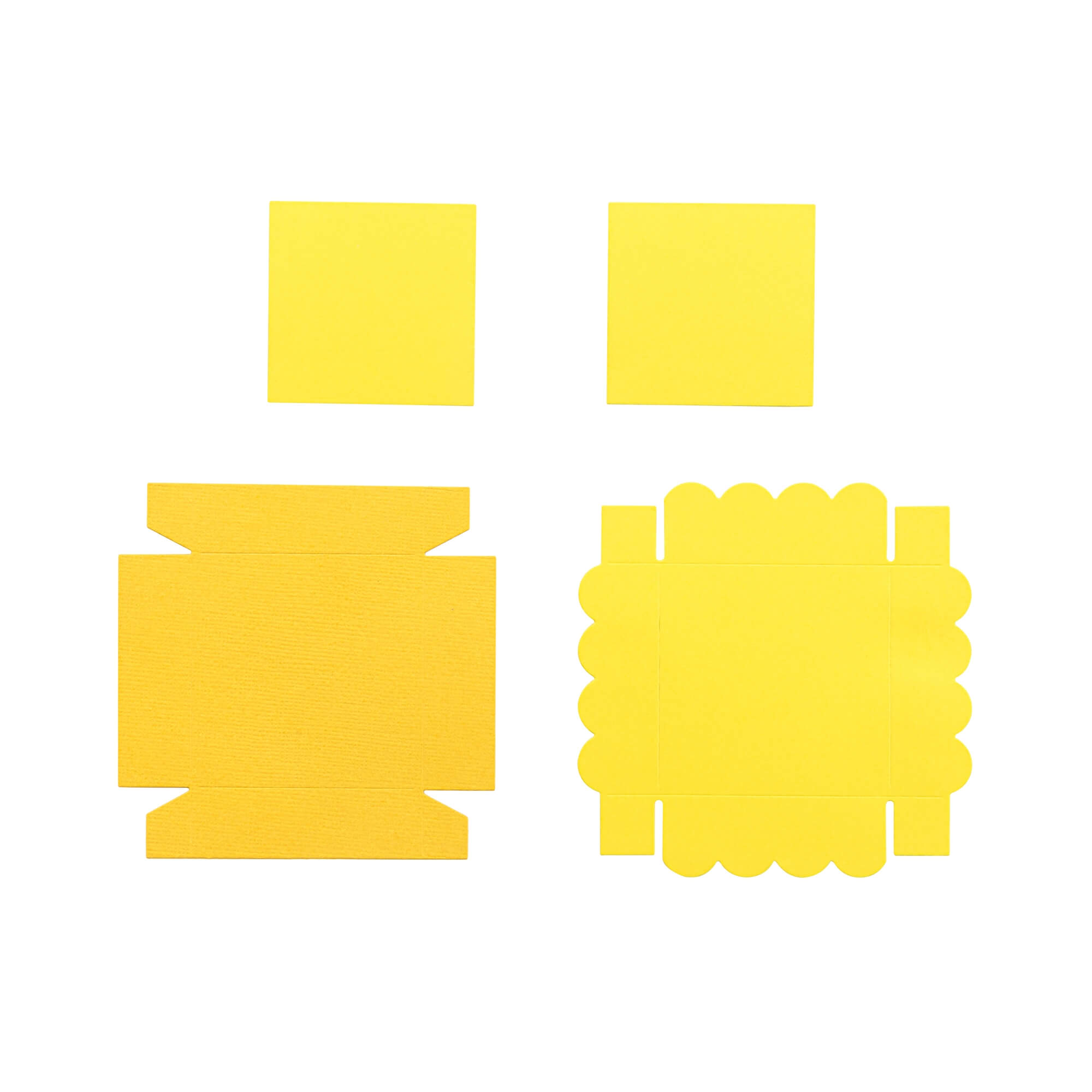 Quadratische Box, Gesamte Stanze ca. 17 x 17,2 cm groß, zwei einzelne Teile 10,2 x 10,7 cm. Gebasteltes Schachtel ca. 6,2 x 6,2 cm.