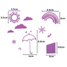 Regenschirm und Wolken, Regenschirm 4 x 6,5 cm, Sonne 3,7 x 3,7 cm, Regenbogen 5,5 x 3 cm.