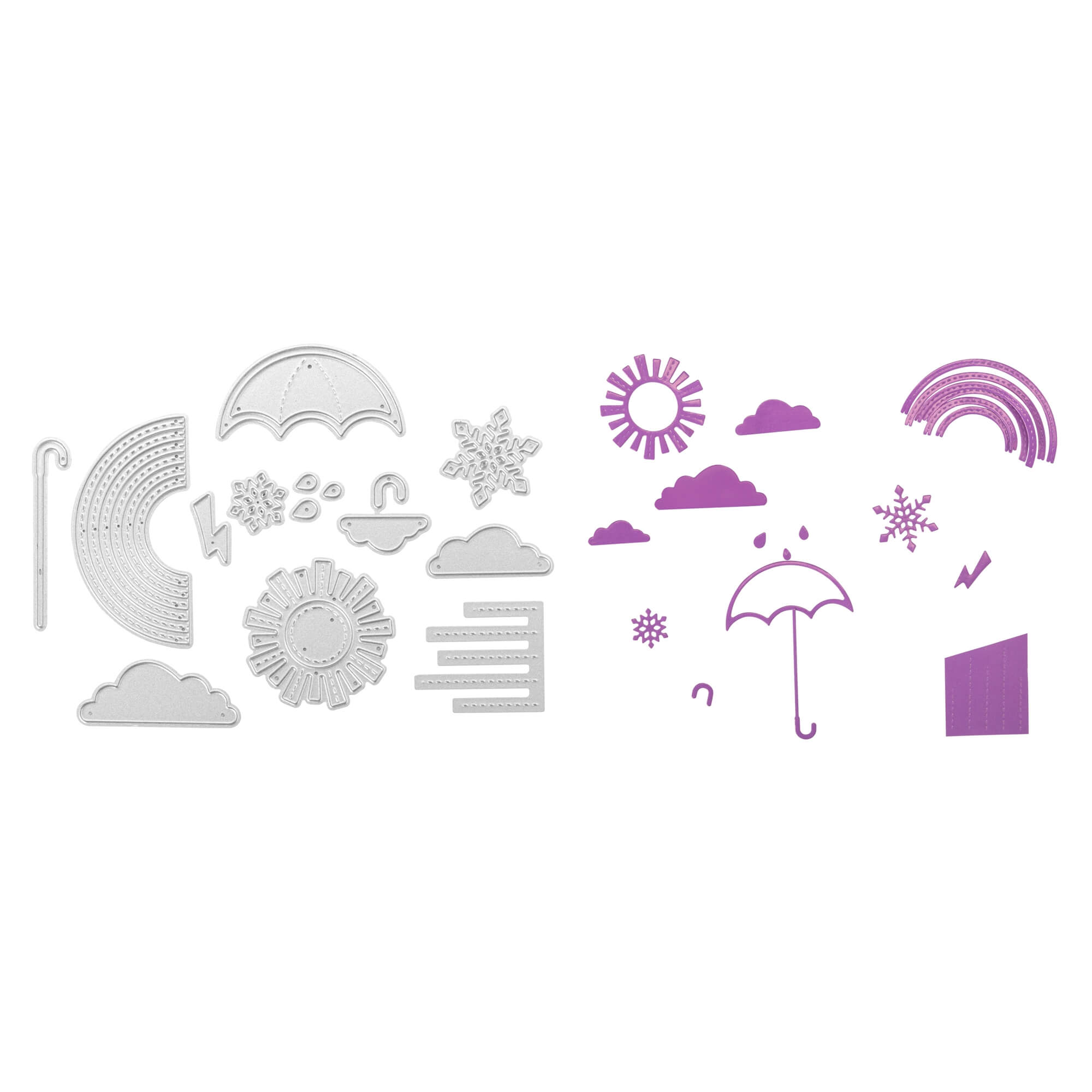 Unsere Stanzschablonen sind grundsätzlich mit allen Stanzmaschinen kompatibel, wenn sie hineinpassen. Für die Stanzschablone Regenschirm und Wolken gilt: