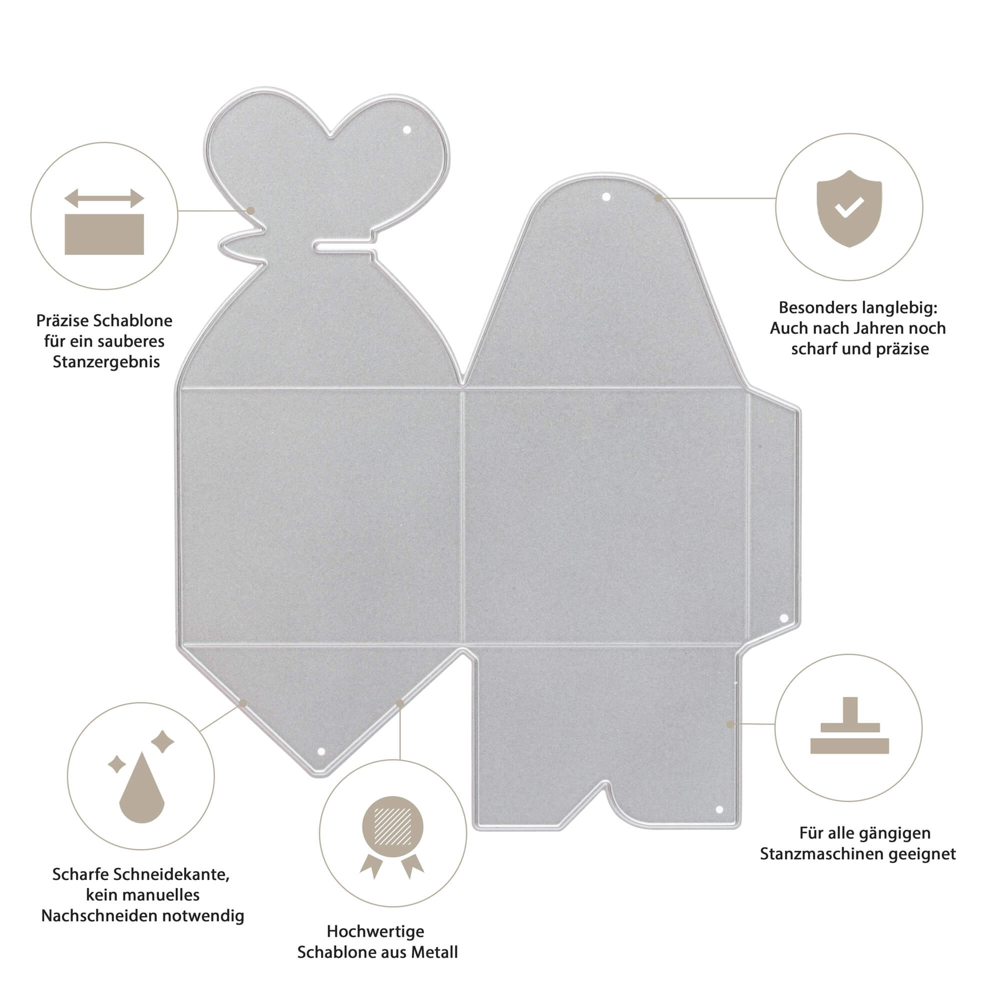 Größe ca. 11,2 x 12,8 cm (Stanze) und 4,8 x 5,6 cm x 4,6 cm (fertige Schachtel).