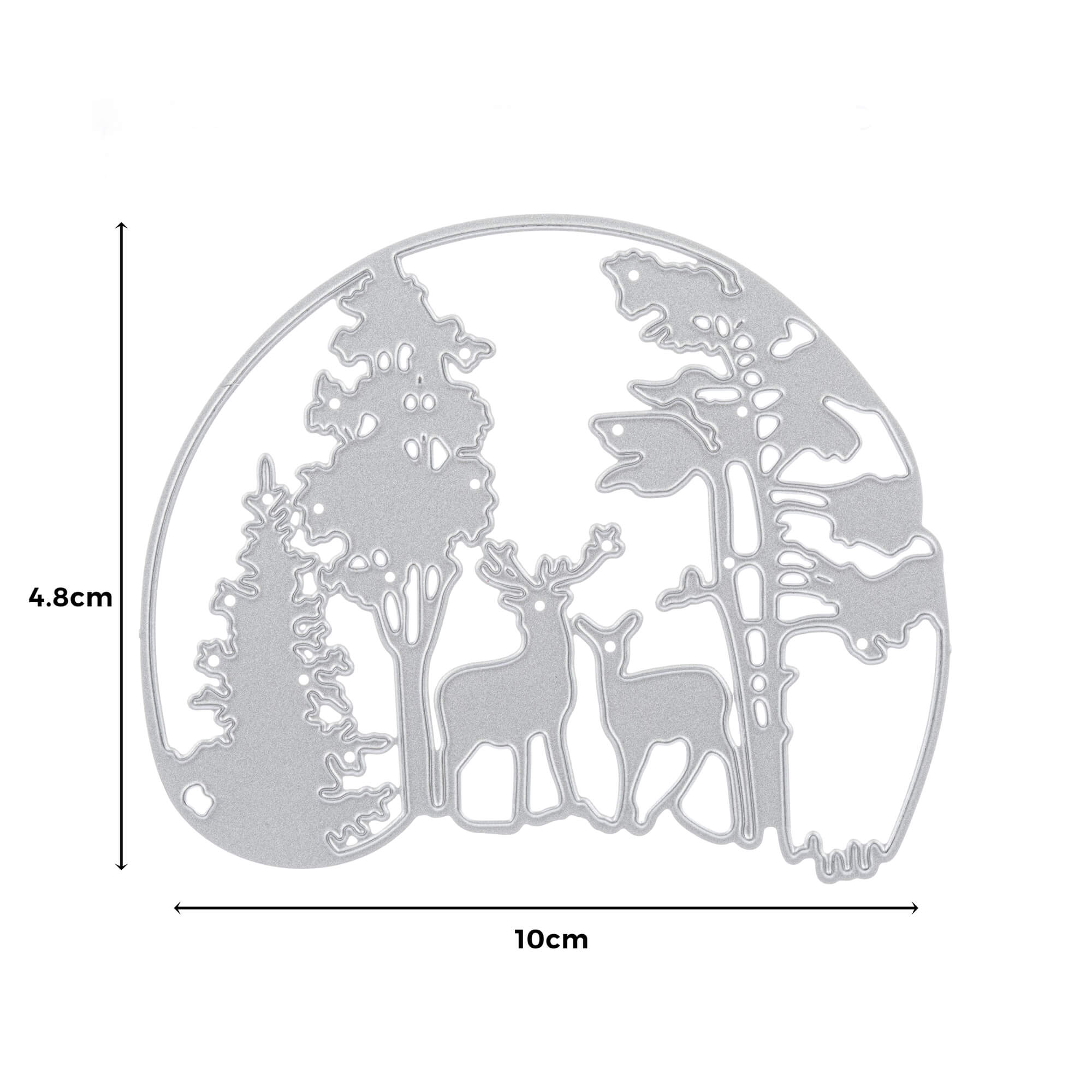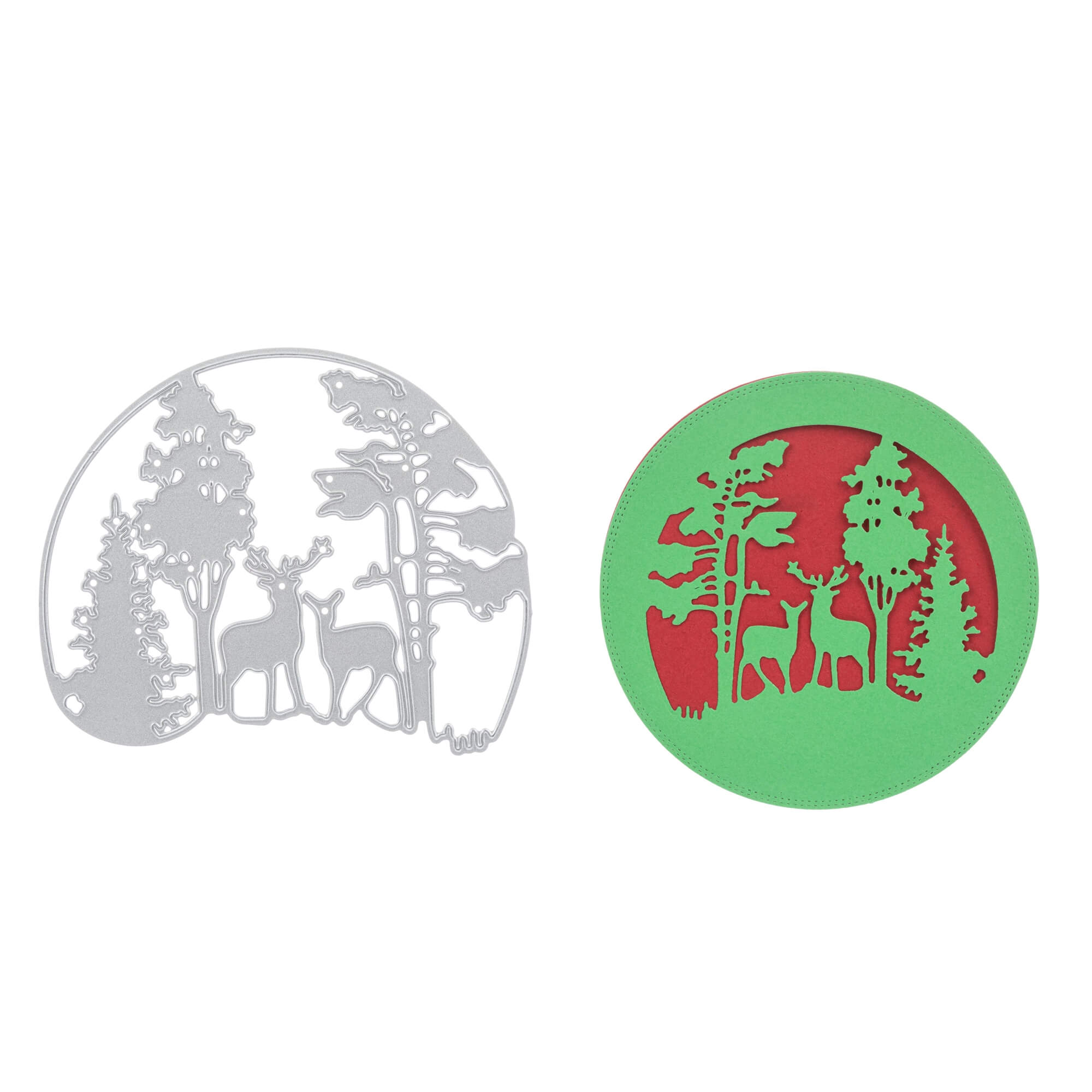 Winterlandschaft mit zwei Rentieren und mehreren Bäumen in einem Halbkreis, Größe ca. 10,1 x 8,3 cm.