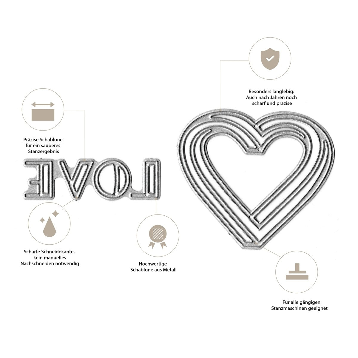 Alle abgebildeten Stanzen sind enthalten. Zubehör wie Papier oder Maschinen ist nicht Teil des Lieferumfangs