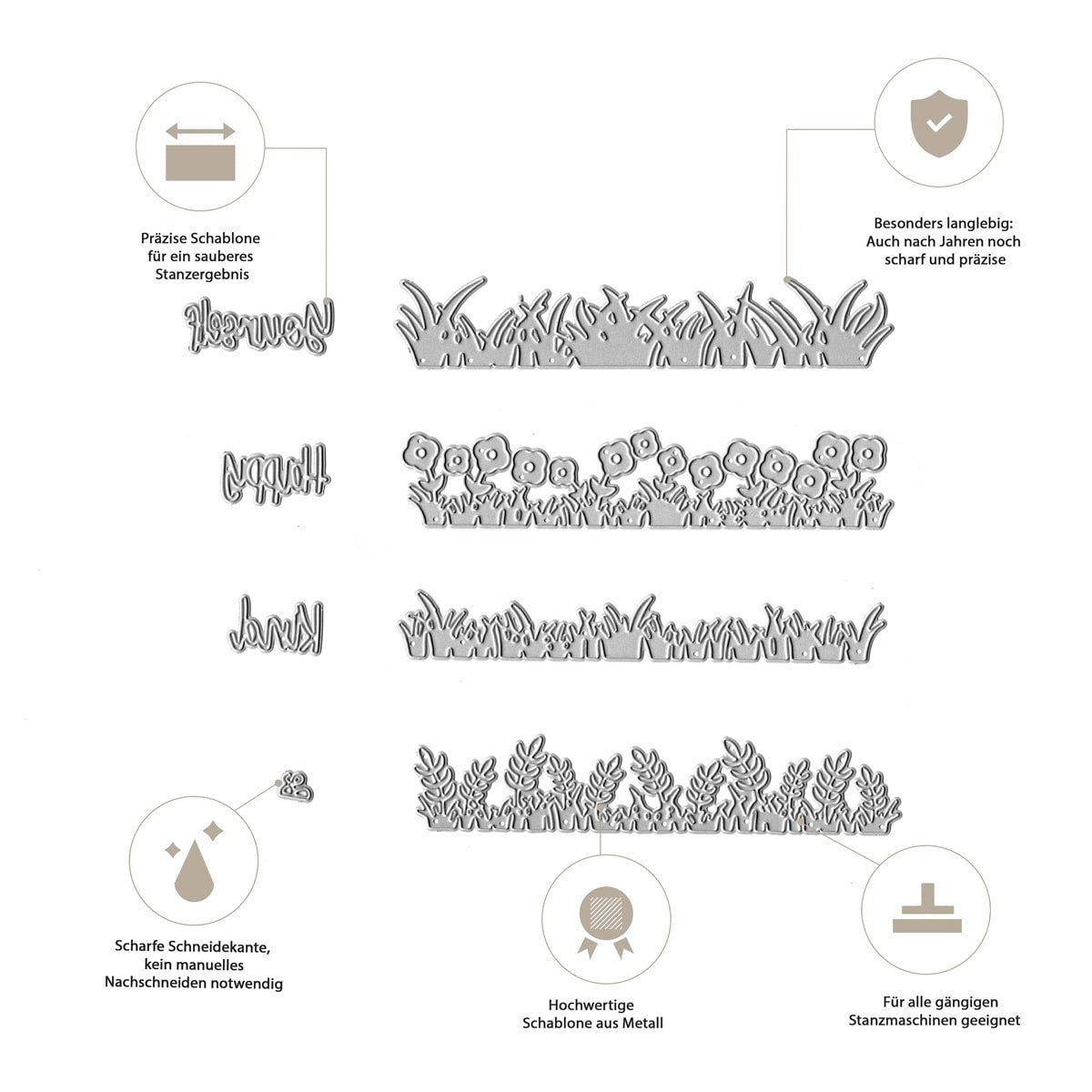 Alle abgebildeten Stanzen sind enthalten. Zubehör wie Papier oder Maschinen ist nicht Teil des Lieferumfangs
