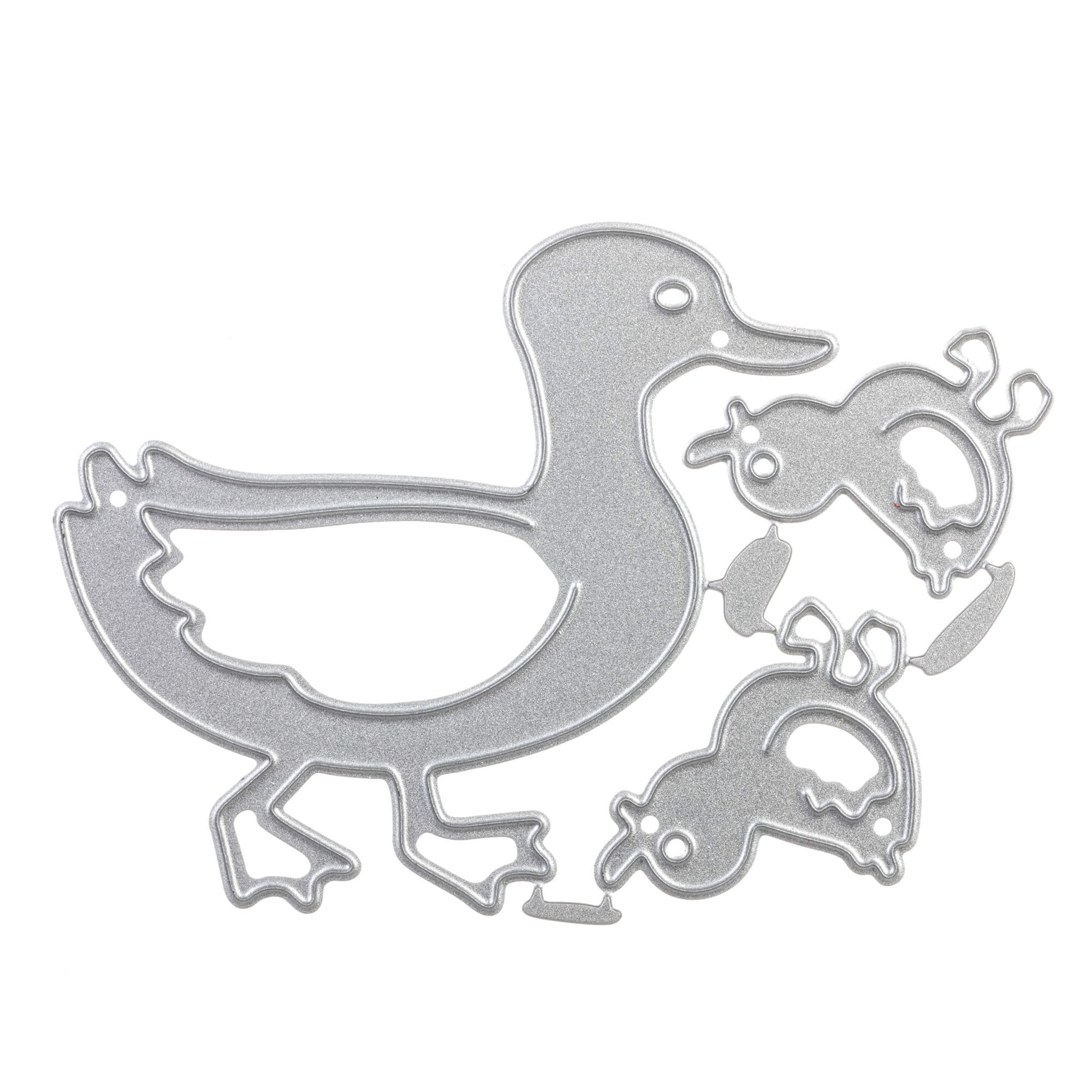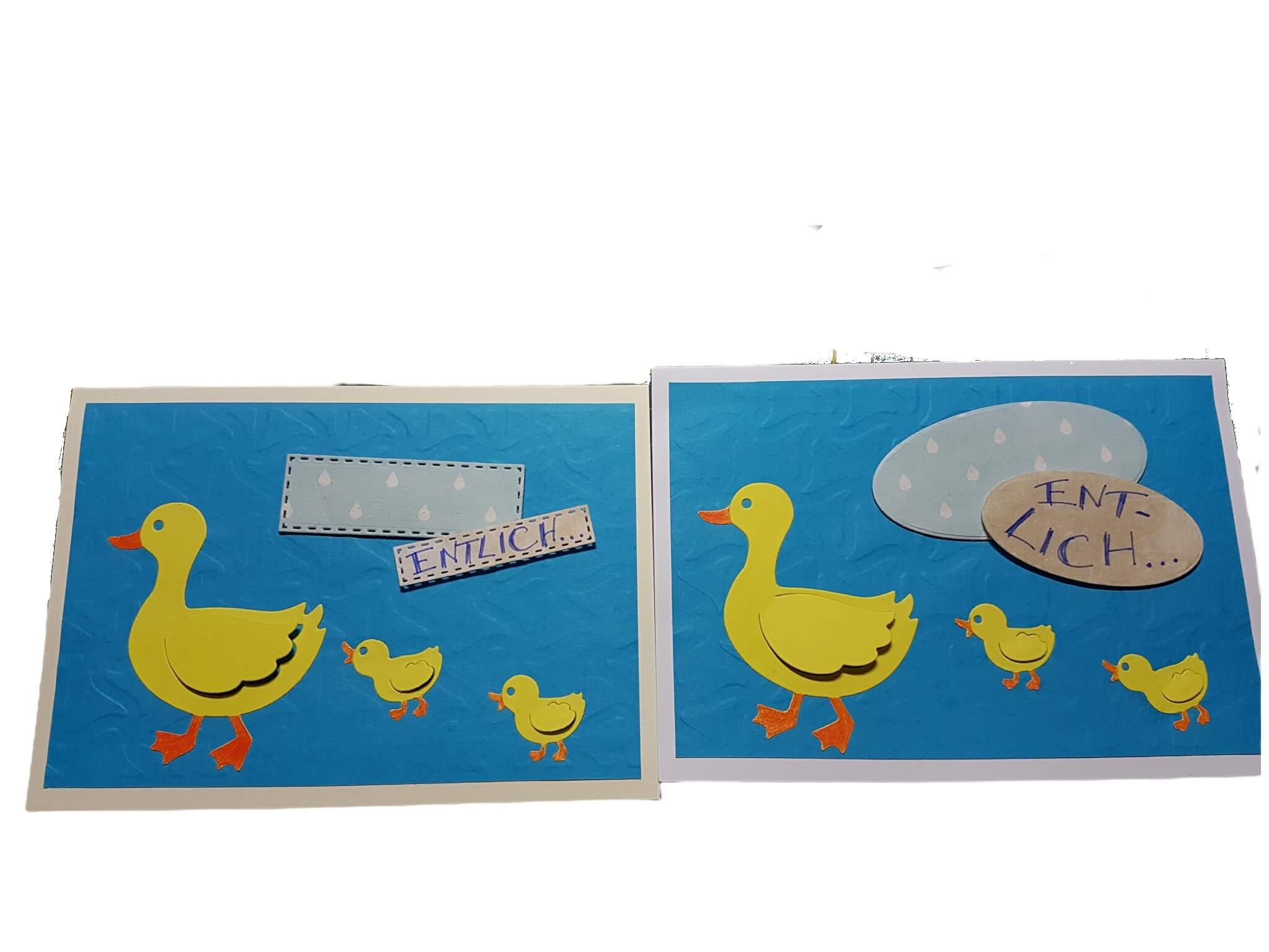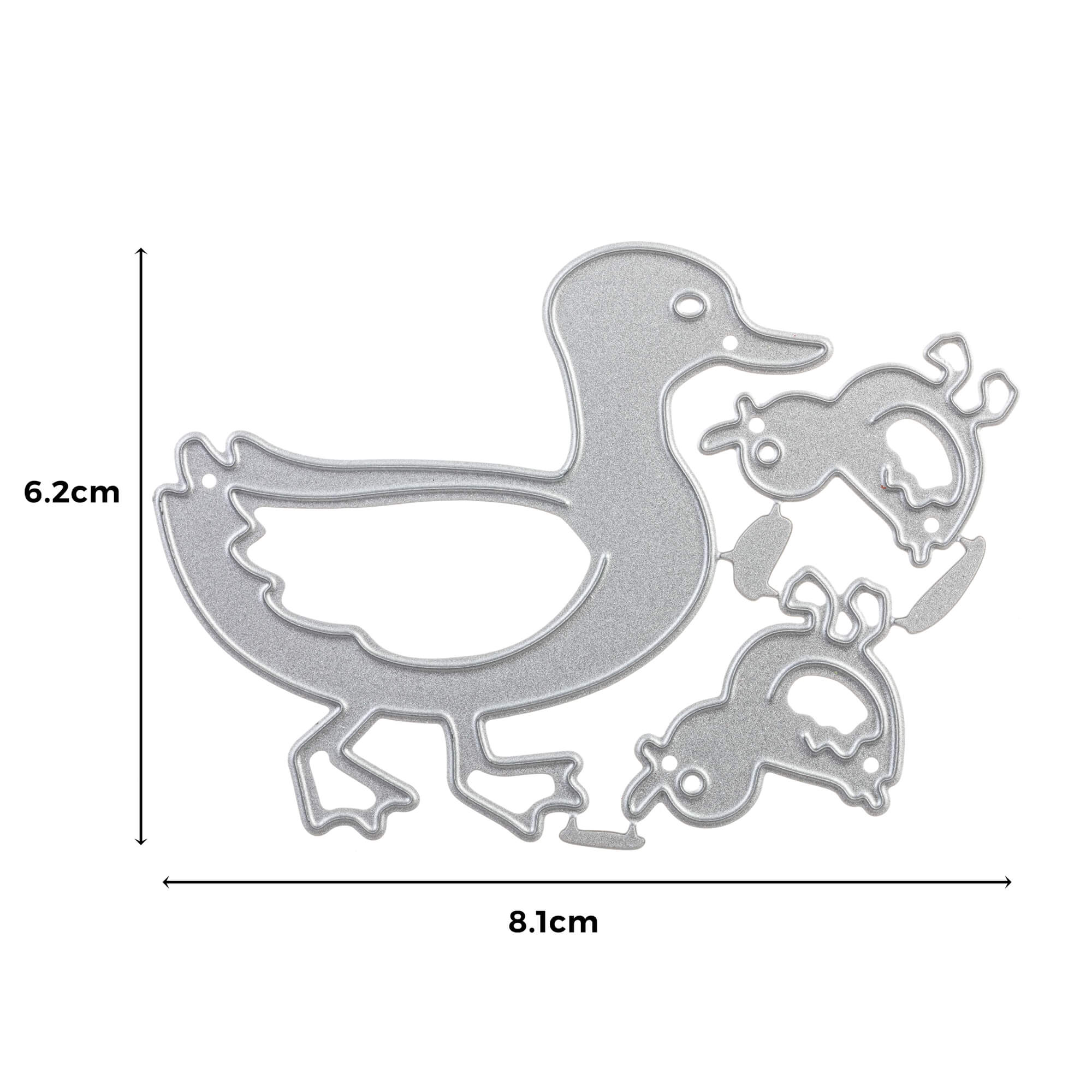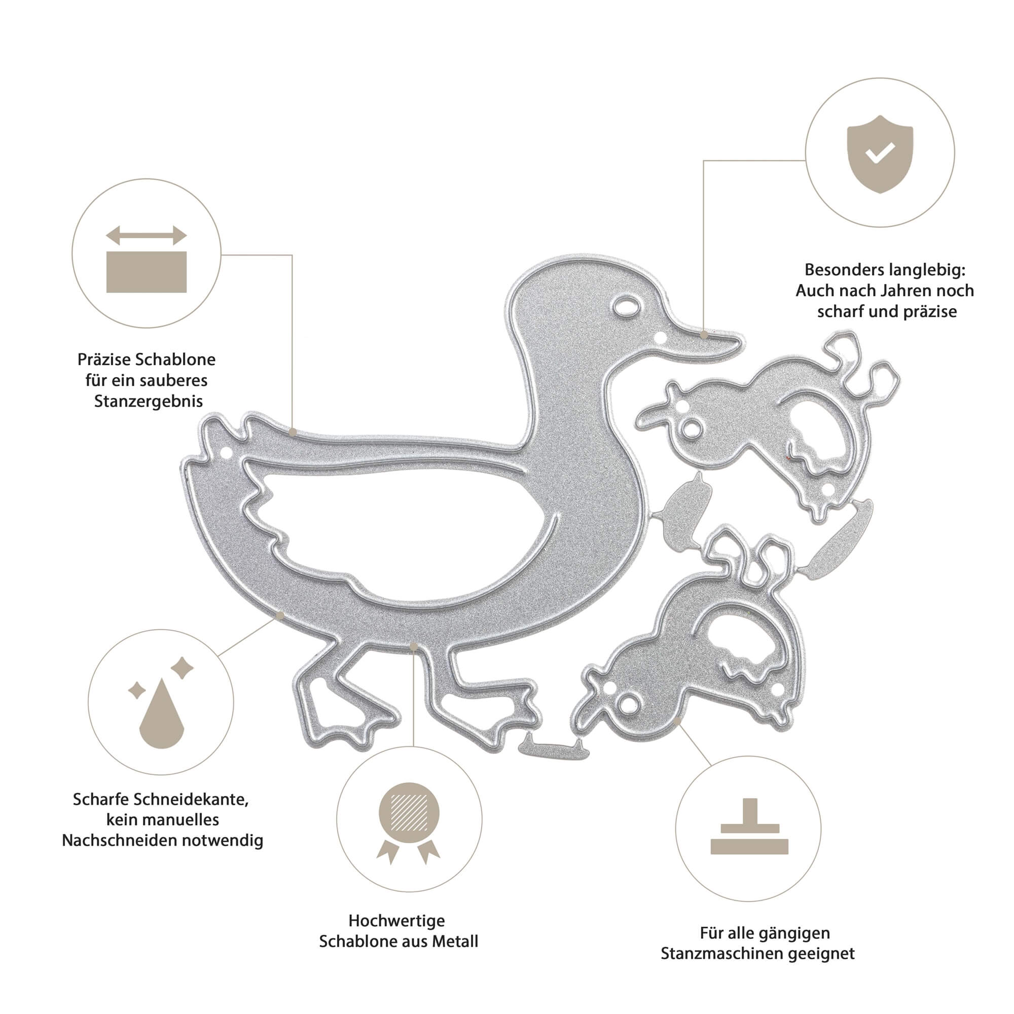 Eine Entenmutter und zwei Küken als seperate Stanzen, Größe ca. 5,6 x 6,3 cm (Ente) und 2,4 x 1,9 cm (Küken).