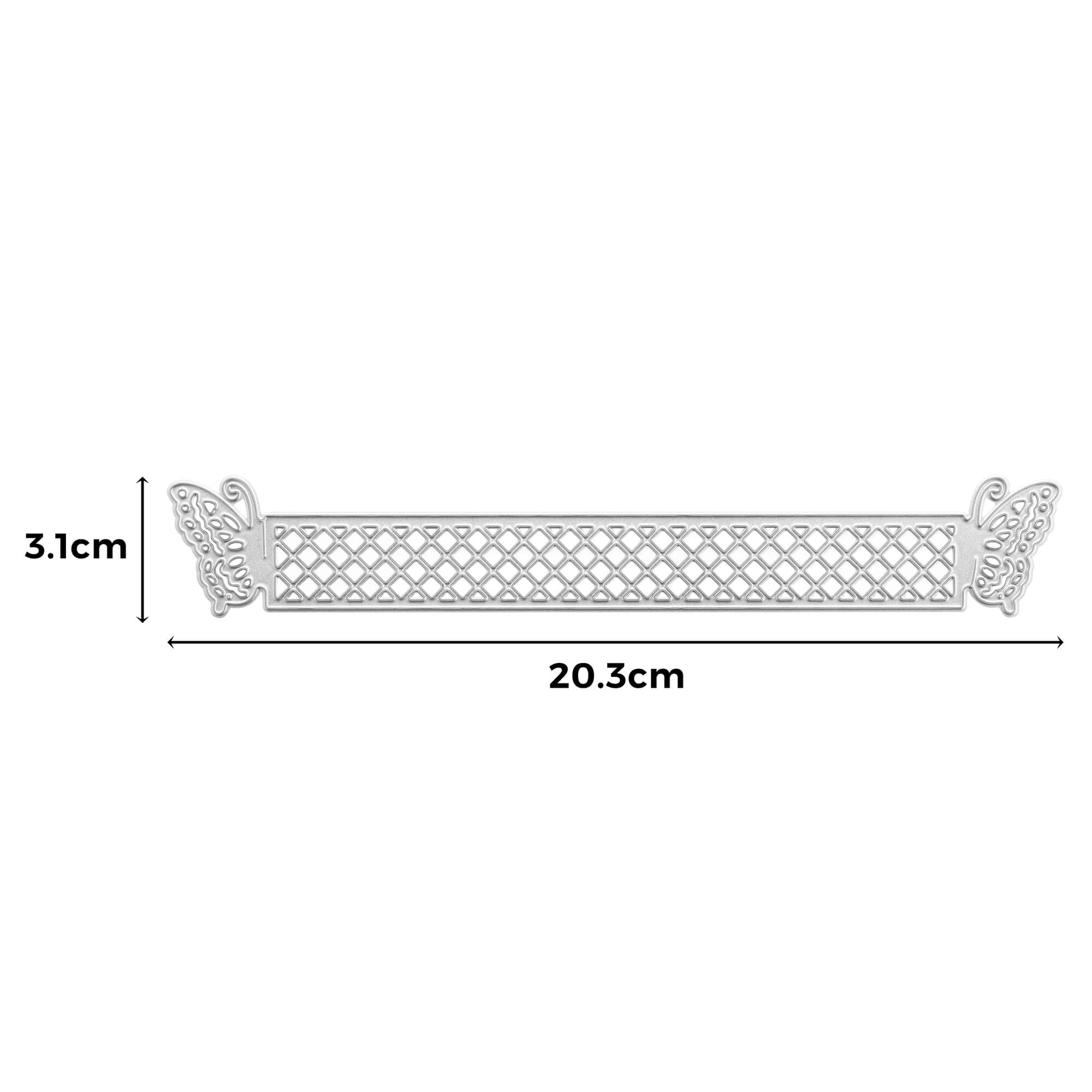 Band mit Gittermuster und Schmetterling, Gesamte Stanze ca. 20,3 x 3,1 cm groß.