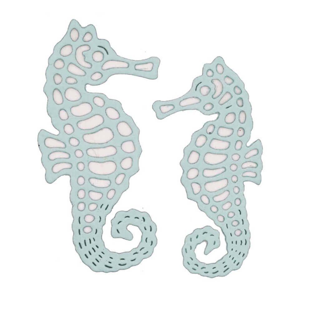 Zwei verschieden große Seepferdchen mit Muster, Gesamte Stanze ca. 5 x 6 cm groß, Großes Seepferdchen ca. 2,5 x 6 cm, Kleines Seepferdchen ca. 2 x 5 cm groß.