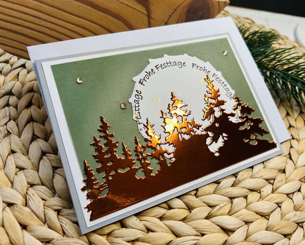 Unsere Stanzschablonen sind grundsätzlich mit allen Stanzmaschinen kompatibel, wenn sie hineinpassen. Für die Stanzschablone: Landschaft aus Tannenbäumen gilt: