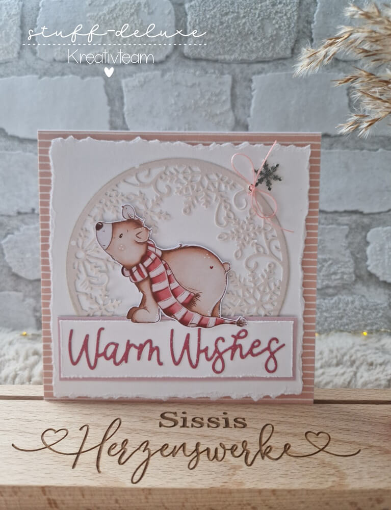 Diese zauberhafte quadratische Winterkarte von Sissi vom Instagram Account tilas_herzenswerke fängt mit der filigranen Stanzschablone Schneekristallkreis die ganze Magie einer frostigen Nacht ein. Die Kombination aus sanften rosa Streifen, dem strukturierten Rand und dem niedlichen Bären-Motiv im Fokus zeigt eindrucksvoll, wie dieser kunstvolle Kreis als perfektes Fenster für liebevolle Wintergrüße dient.