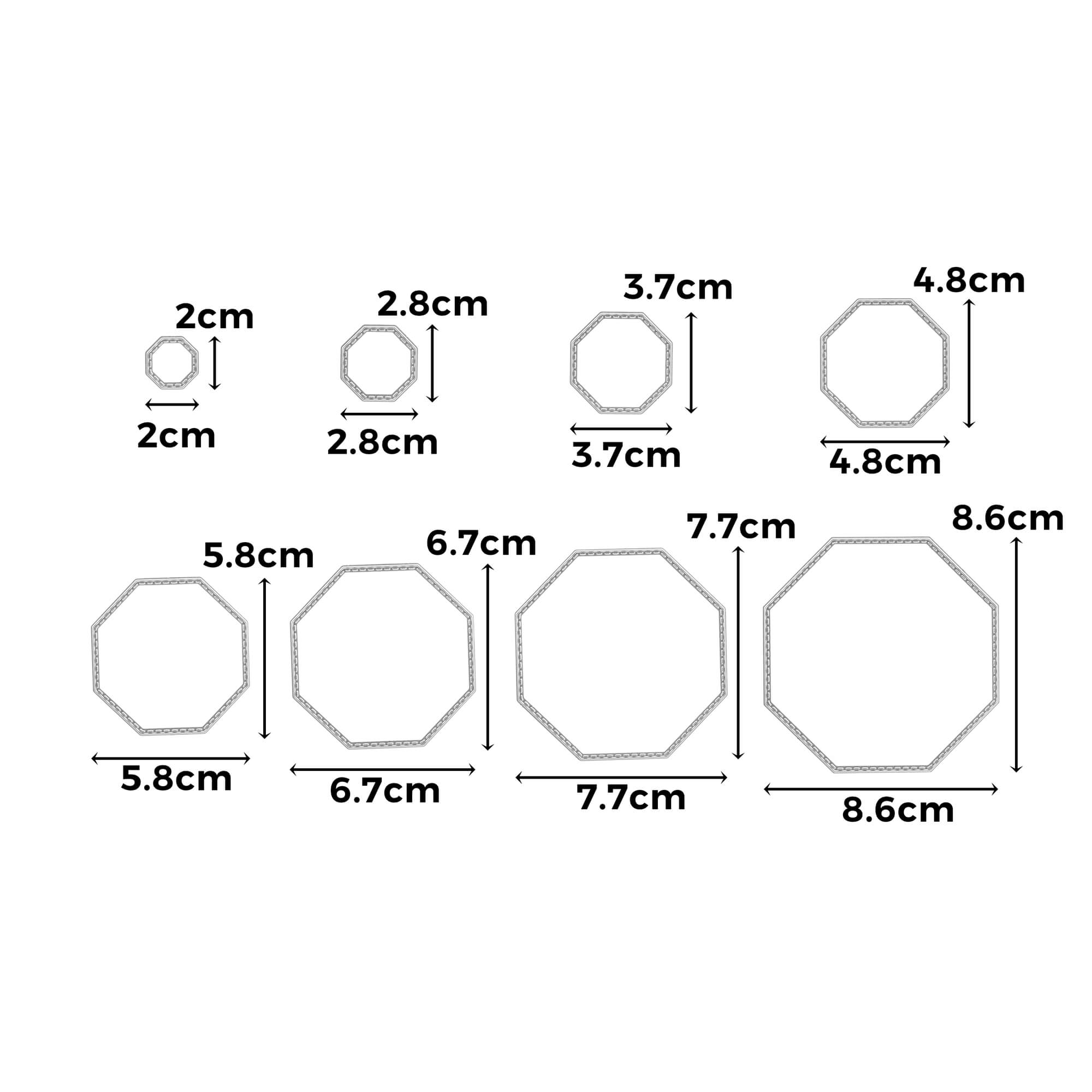 Entdecke die Vielseitigkeit der Stanzschablone Achteckige Rahmen in acht verschiedenen Größen. Perfekt für alle Bastelprojekte, von Karten bis zu Scrapbooks. Mit präzisen Schnitten und klaren Linien, wird jedes Projekt zum Meisterwerk. Einfach zu bedienen und langlebig, diese Schablone ist ein Muss für jeden Bastelliebhaber. Lass deiner Kreativität freien Lauf und verwandle einfache Materialien in atemberaubende Kunstwerke. Hol dir jetzt deine Stanzschablone und beginne dein nächstes Bastelabenteuer!