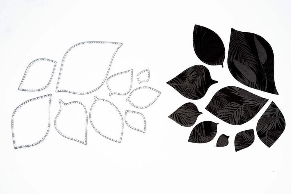 Set aus mehreren Blätterstanzen. Insgesamt sind neun Stanzen im Set enthalten, Größe der Stanzen: Blatt 1 (4 Stanzen): 2 x 3 cm bis 5,4 x 8,7 cm; Blatt 2 (3 Stanzen): 1,3 x 2 cm bis 4 x 5,6 cm; Blatt 3 (2 Stanzen): 3,9 x 2,2 cm und 5,6 x 3,2 cm.