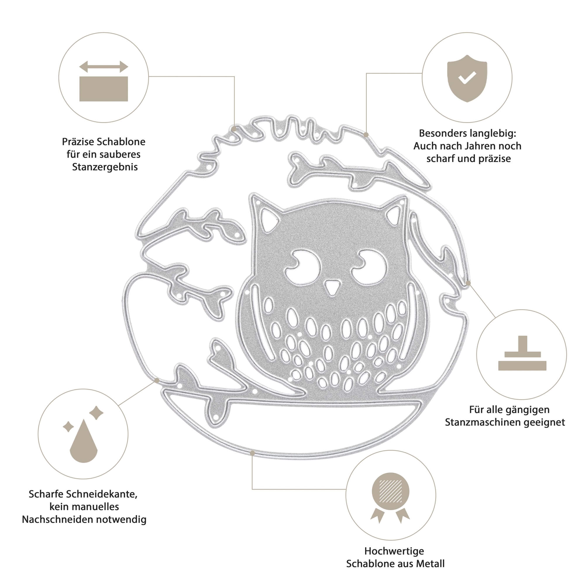 Unsere Stanzschablonen sind grundsätzlich mit allen Stanzmaschinen kompatibel, wenn sie hineinpassen. Für die Stanzschablone Eule auf einem Ast gilt: