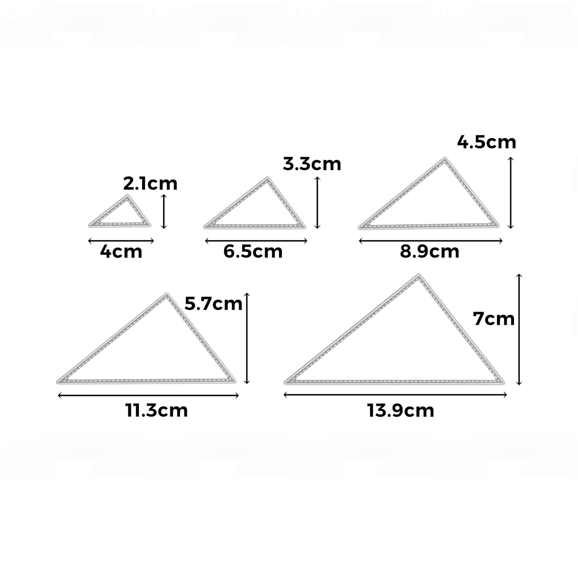 Fünf Dreiecke in verschiedenen Größen. Die Dreiecke sind nicht symetrisch, Größe ca. 14,2 x 7,2 cm (Größtes Dreieck) und 4,4 x 2,4 cm (Kleinstes Dreieck).
