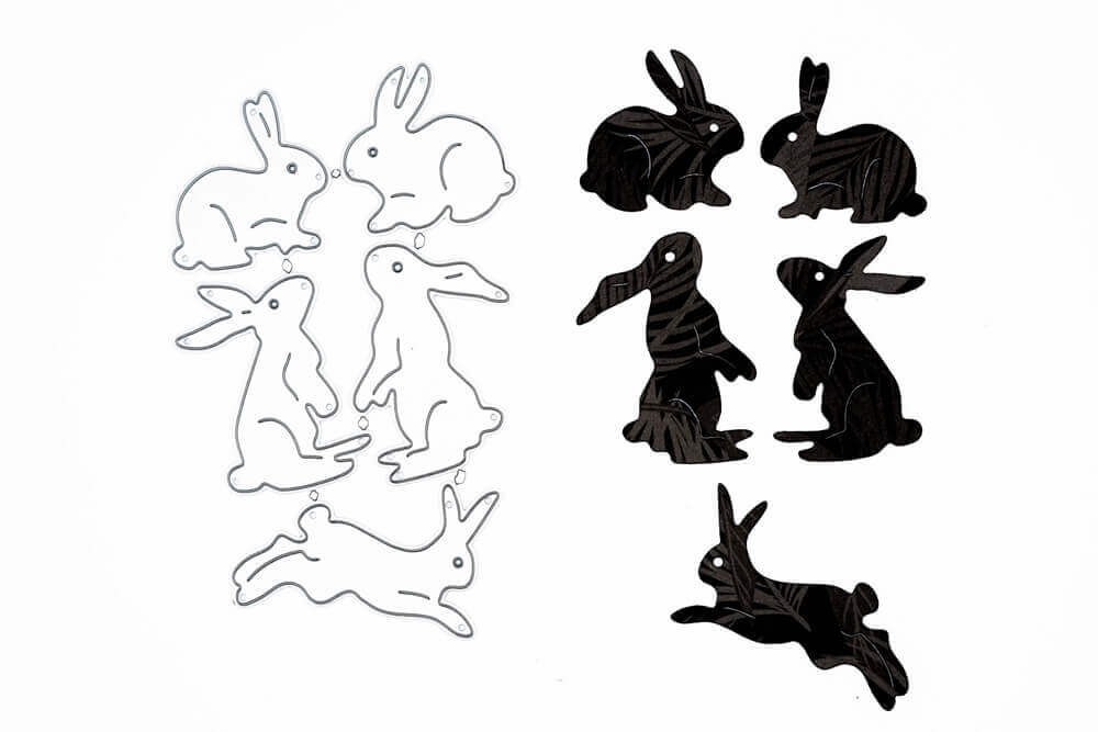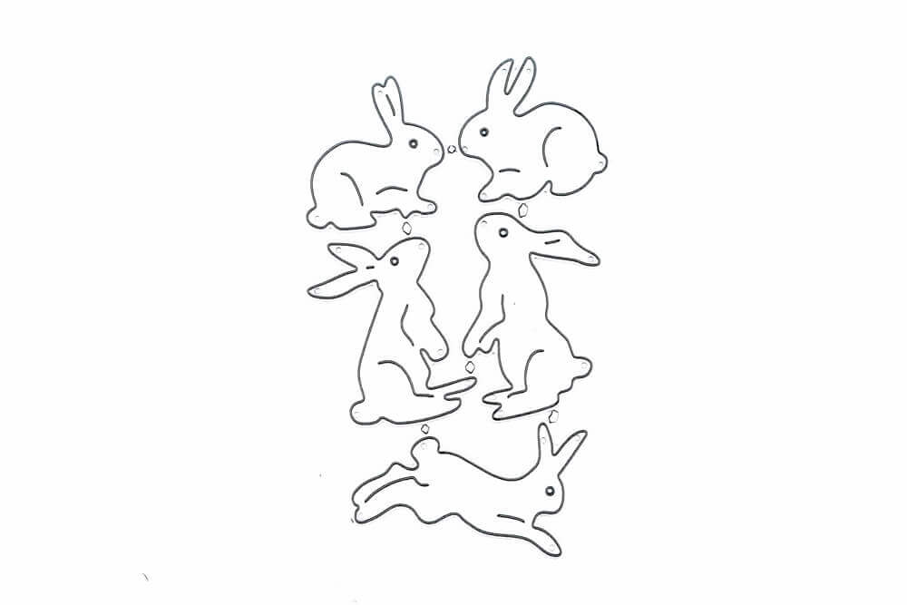 Fünf verschiedene Hasen im Set, Größe der Stanzschablonen: 3,2 x 3 cm / 3,2 x 3,1 cm / 3 x 4,1 cm / 3,2 x 4,4 cm / 5 x 3 cm.